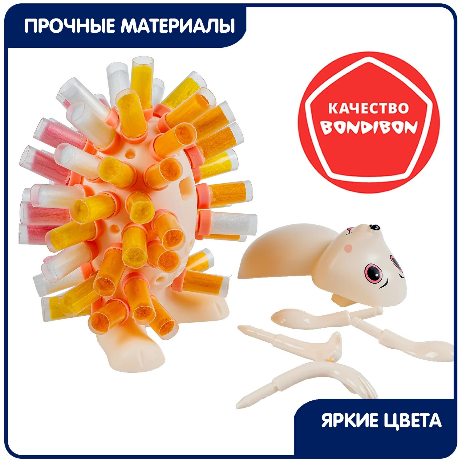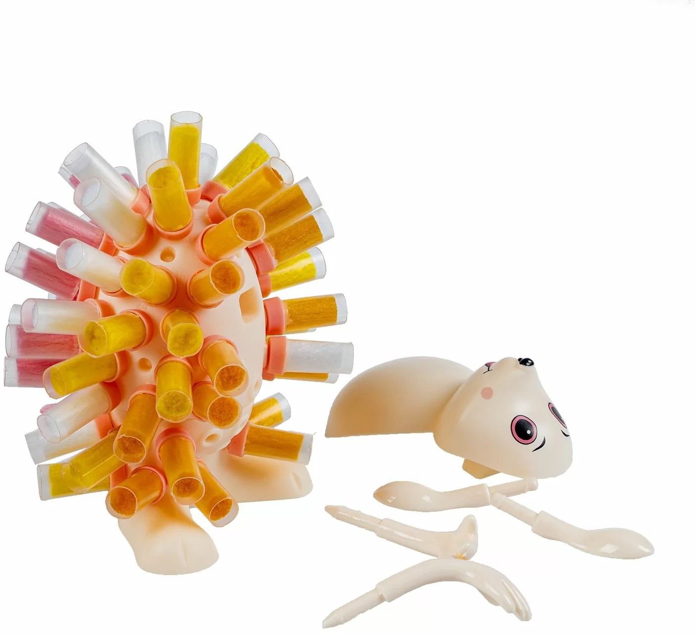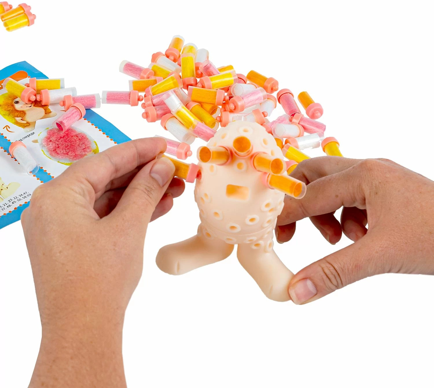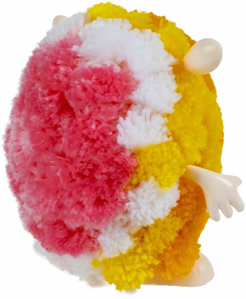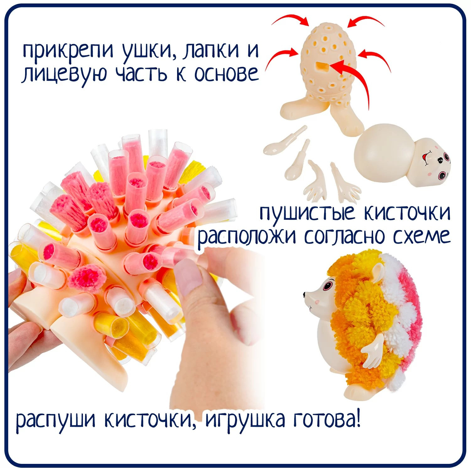 В наборе вы найдете все необходимое для создания этого солнечного пушистика: 1 основа ежика, 1 лицевая часть, 2 ушка, 2 лапки из пластмассы и набор цветных текстильных кисточек. Всего 70 деталей.