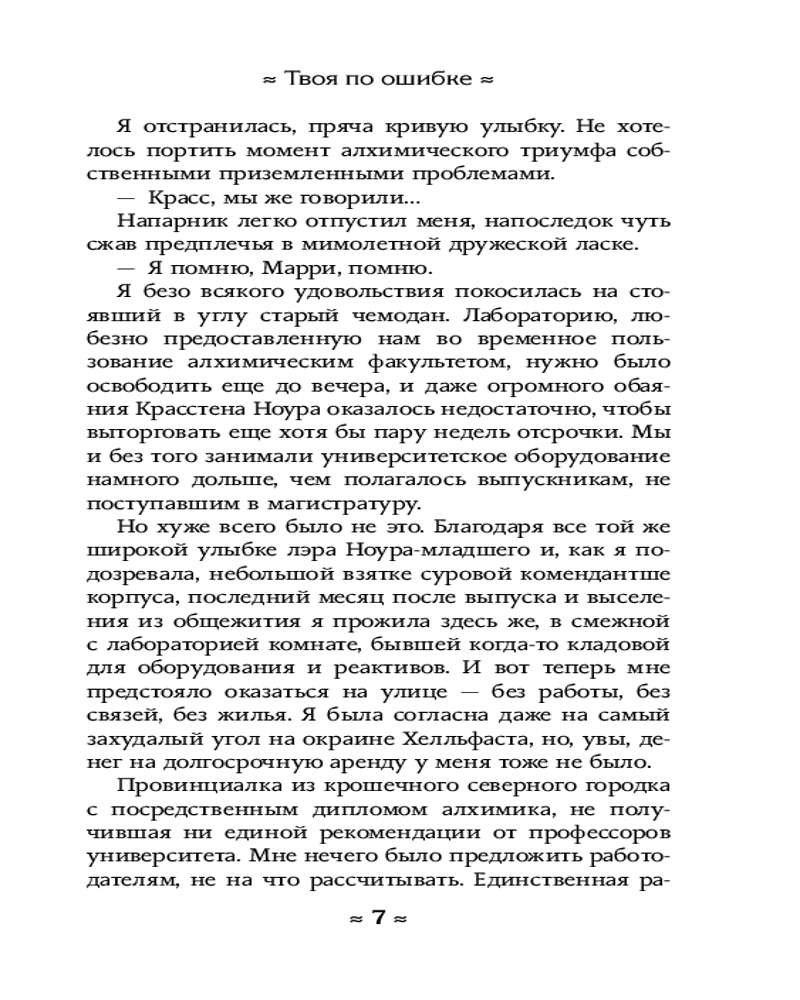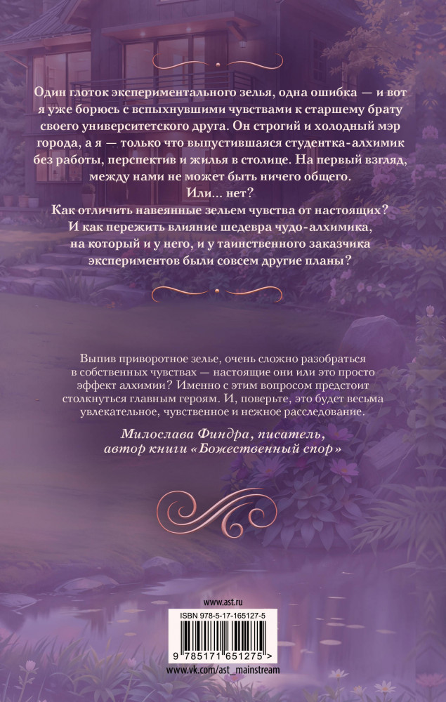 Твоя по ошибкеАнастасия Волжская, Валерия Яблонцева В данный момент этот товар отсутствует в продаже. Возможно, у нас найдется аналогичный или похожий товар здесь. Серия: Магическая любовь Один глоток экспериментального зелья, одна ошибка — и вот я уже борюсь с вспыхнувшими чувствами к старшему брату своего университетского друга. Он строгий и холодный мэр города, а я — только что выпустившаяся студентка-алхимик без работы, перспектив и жилья в столице. На первый взгляд, между нами не может быть ничего общего. Или... нет? Как отличить навеянные зельем чувства от настоящих? И как пережить влияние шедевра чудо-алхимика, на который и у него, и у таинственного заказчика экспериментов были совсем другие планы? |