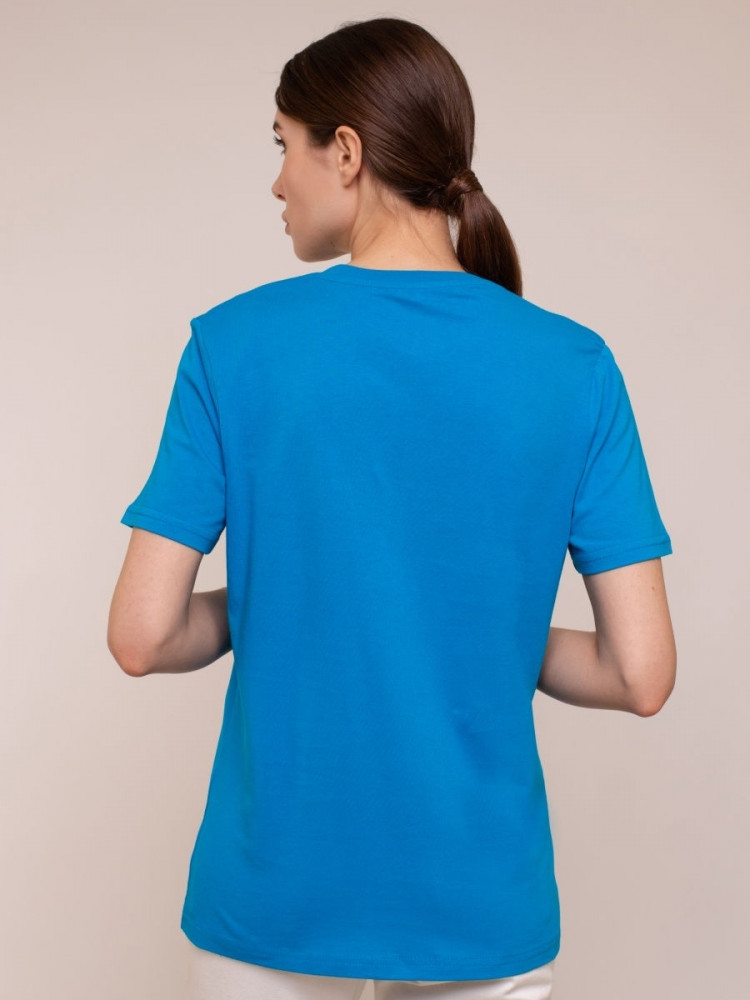 Футболка 48 размера, рост 164, на 50 размер рост 160 свободная. Очень хороший пошив, аккуратный, горловина обработана отлично. Ткань плотная, трикотажная, мало тянущаяся. Фасон прямой, со спущенным плечом. Цвет не такой яркий, как на фотографии сайта, он именно песочный.