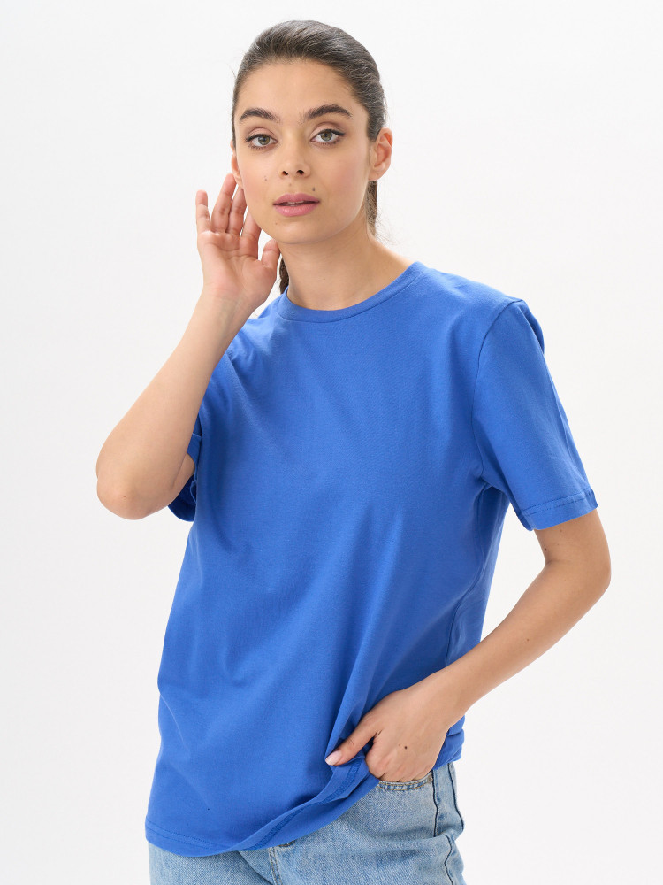 Футболка 48 размера, рост 164, на 50 размер рост 160 свободная. Очень хороший пошив, аккуратный, горловина обработана отлично. Ткань плотная, трикотажная, мало тянущаяся. Фасон прямой, со спущенным плечом. Цвет не такой яркий, как на фотографии сайта, он именно песочный.