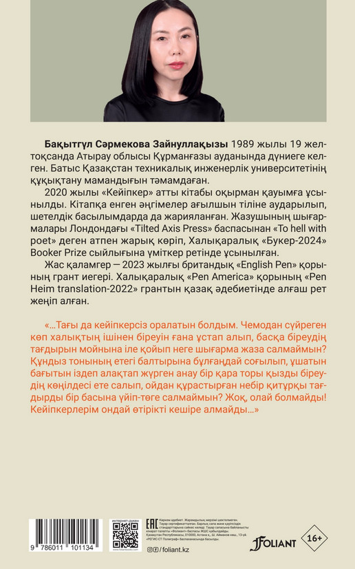 💳 Оплатить за товар можно при получении 🇰🇿 Есть бесплатная доставка по Казахстану от 1 дня 🎁 Копите бонусы с каждой покупки Серия: Бүгінгі проза Бақытгүл Сәрмекова — қазіргі жас қаламгерлердің арасында өзіндік стилімен, айрықша жазу машығымен ерекшеленетін жазушы. Оның әңгімелерінде замандас бейнесі сан қырынан ашылады, қарапайым ауыл өмірінің суреттері шынайы да боямасыз, табиғи қалпында баяндалады. Автордың өз кейіпкерлерінің ішкі арпалысы мен жан дүниесінің иірімдерін жеткізу тәсілі өзгеше. |