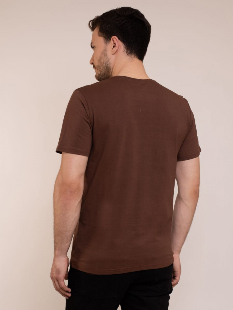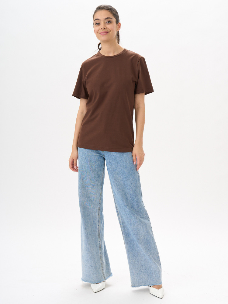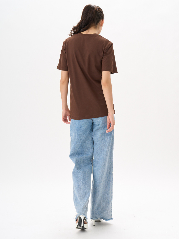 Футболка прямого покроя с втачными короткими рукавами. По линии горловины втачен ворот из ластичного полотна с 5% добавлением лайкры. Перед и спинка цельнокроеная. Плечевые швы обтачены бейкой из основного полотна, в край проложена отделочная строчка. Низ футболки и рукава подогнуты и подшиты на распошивальной машине.