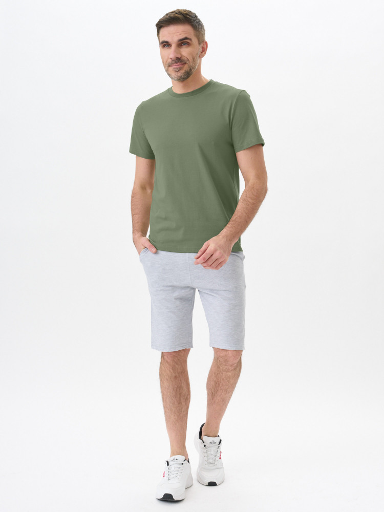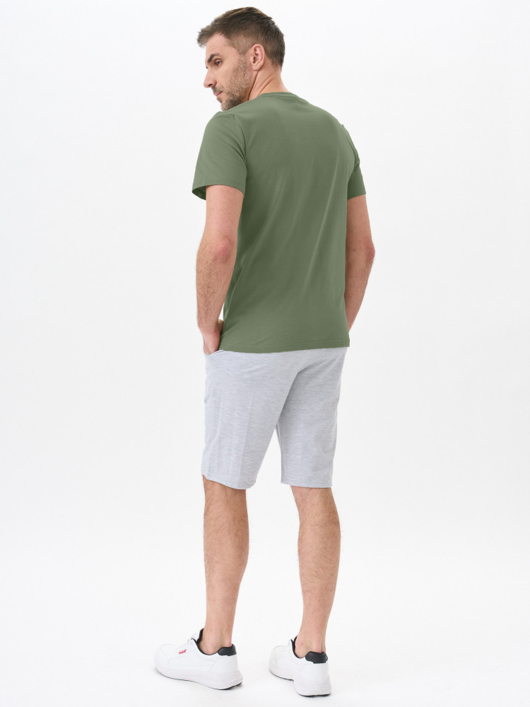 Футболка прямого покроя с втачными короткими рукавами. По линии горловины втачен ворот из ластичного полотна с 5% добавлением лайкры. Перед и спинка цельнокроеная. Плечевые швы обтачены бейкой из основного полотна, в край проложена отделочная строчка. Низ футболки и рукава подогнуты и подшиты на распошивальной машине.