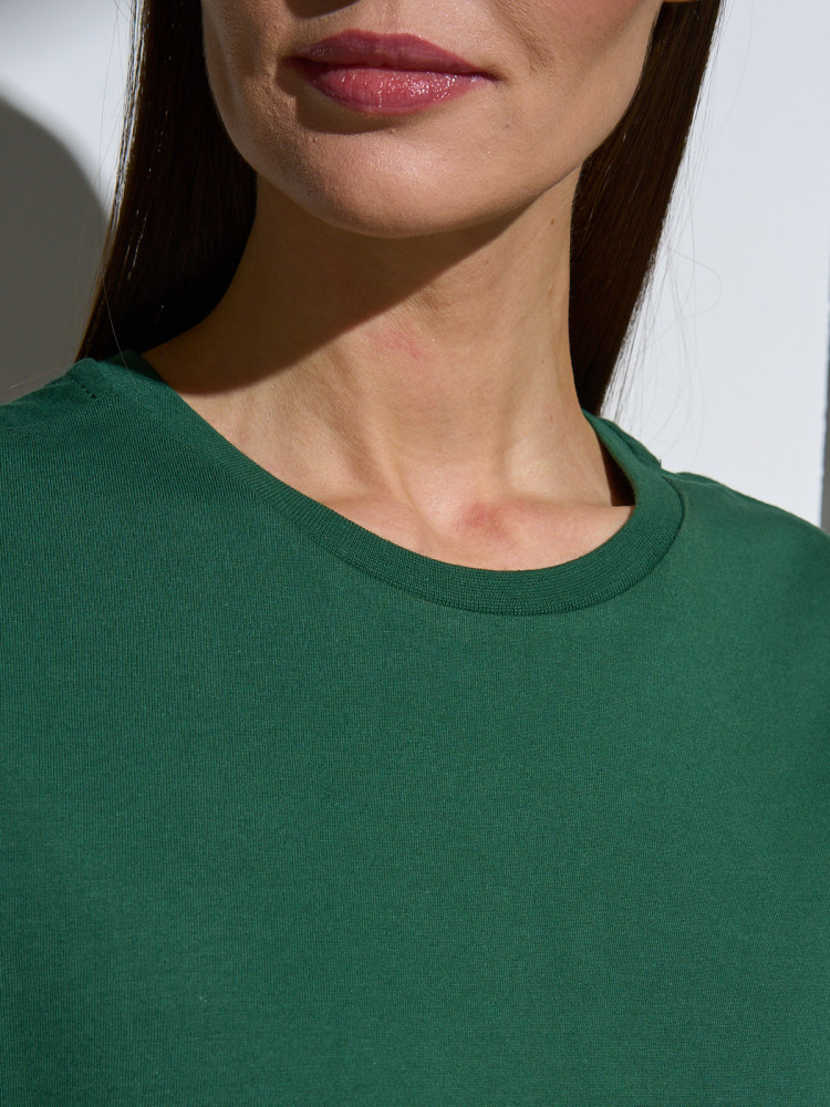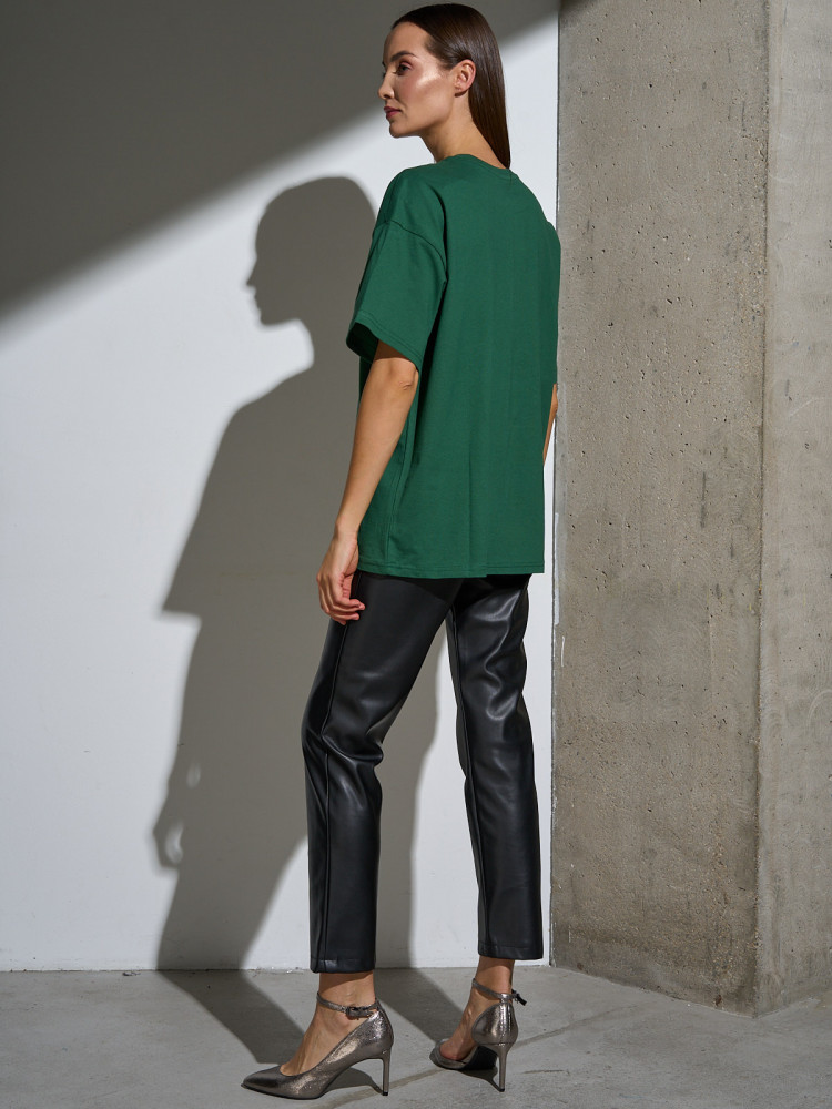 Футболка кроя оверсайз со пущенными втачными удлиненными короткими рукавами. По линии горловины обработан рибаной 1.5 см и втачен ворот из ластичного полотна с 5% добавлением лайкры. Низ футболки и рукава подогнуты и подшиты на распошивальной машине, ширина подгиба 2 см.
