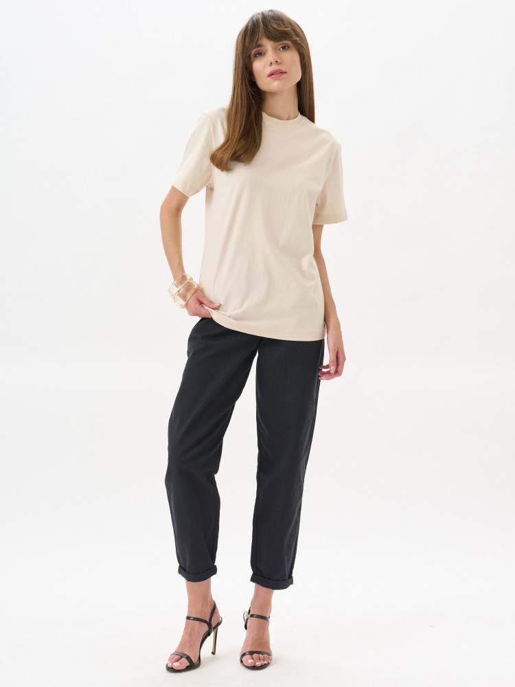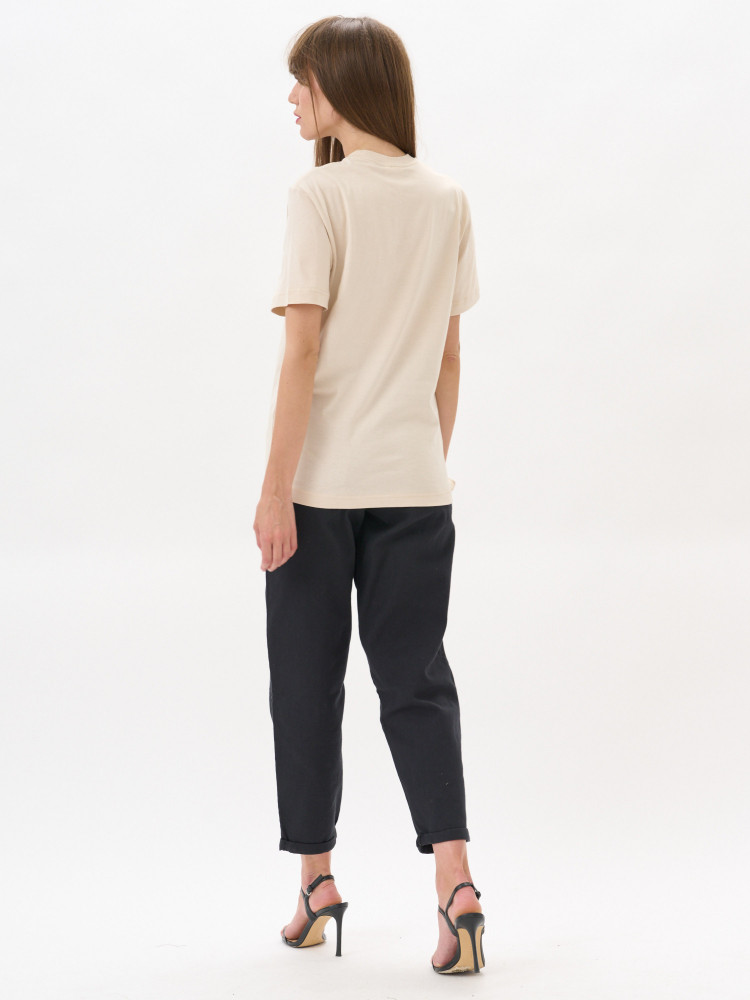 Футболка прямого покроя с втачными короткими рукавами. По линии горловины втачен ворот из ластичного полотна с 5% добавлением лайкры. Перед и спинка цельнокроеная. Плечевые швы обтачены бейкой из основного полотна, в край проложена отделочная строчка. Низ футболки и рукава подогнуты и подшиты на распошивальной машине.