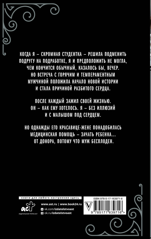 💳 Оплатить за товар можно при получении 🇰🇿 Есть бесплатная доставка по Казахстану от 1 дня 🎁 Копите бонусы с каждой покупки Серия: Твоя любовь Когда я — скромная студентка решила подменить подругу на подработке, я и предположить не могла чем кончится обычный, казалось бы вечер. Но встреча с горячим и темпераментным мужчиной положила начало новой истории и стала причиной разбитого сердца. После каждый зажил своей жизнью. Он — как ему хотелось. Я — без иллюзий и с малышом под сердцем. Но однажды его красавице-жене понадобилась медицинская помощь — зачать ребенка... от донора, потому что муж бесплоден. |