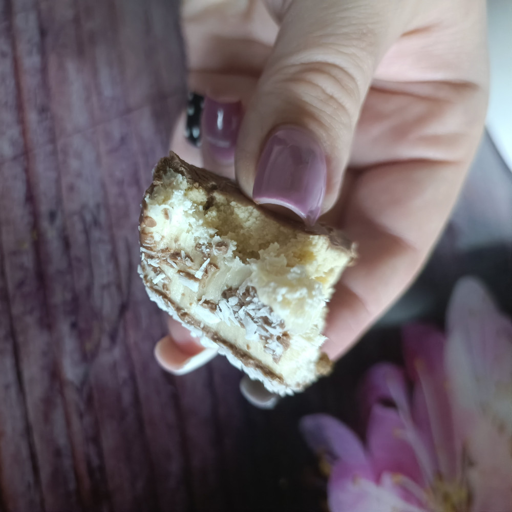Очень вкусный тортик, похож на мягкую нугу с кокосом. Не приторный, не вязкий, к зубам не липнет, не слишком калорийный, сытный. Жаль, что такие лакомства без сахара дороговатое удовольствие.