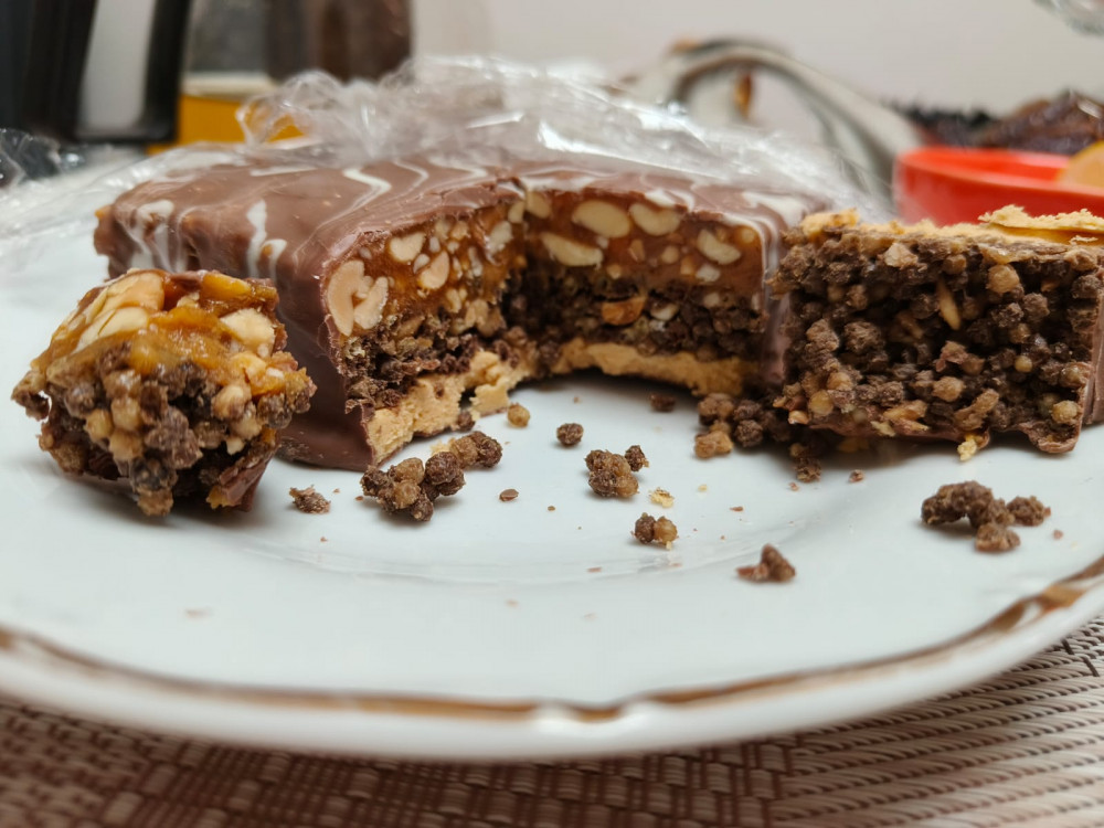 Шоколад или что там его покрывает просто отстойный. Единственное что более менее съедобно лишь орехи наверное, нижний слой как и покрытие неприятное на вкус. Вроде написано без сахара, но у меня разболелись зубы после одного маленького кусочка