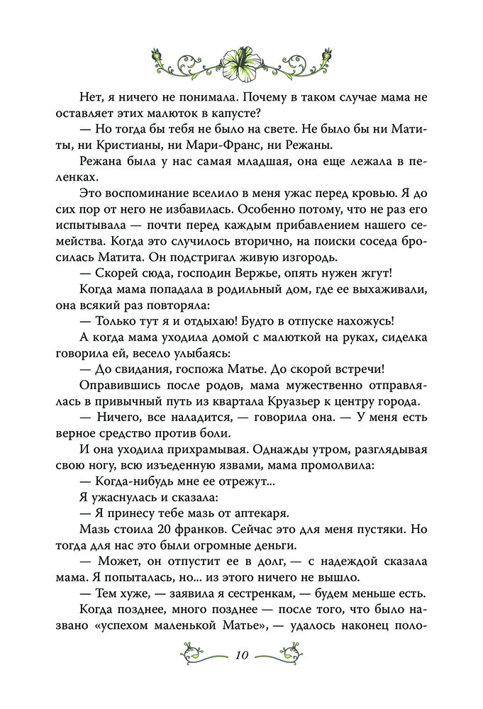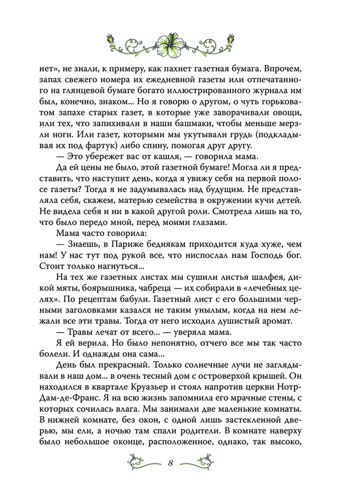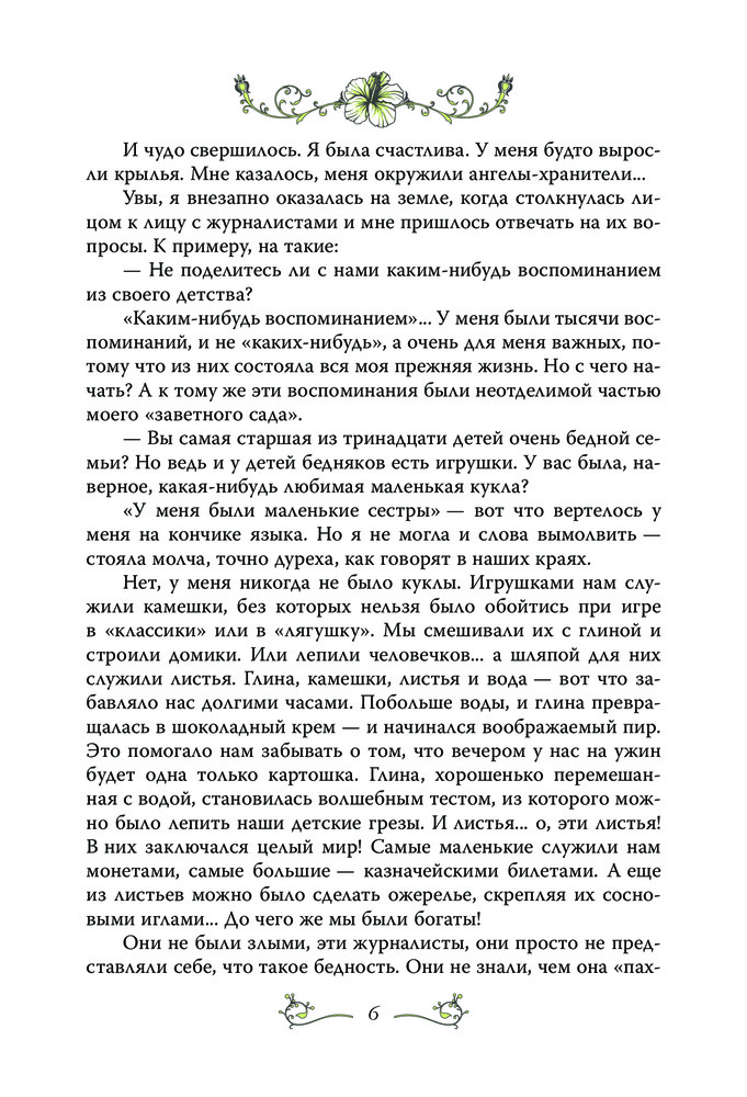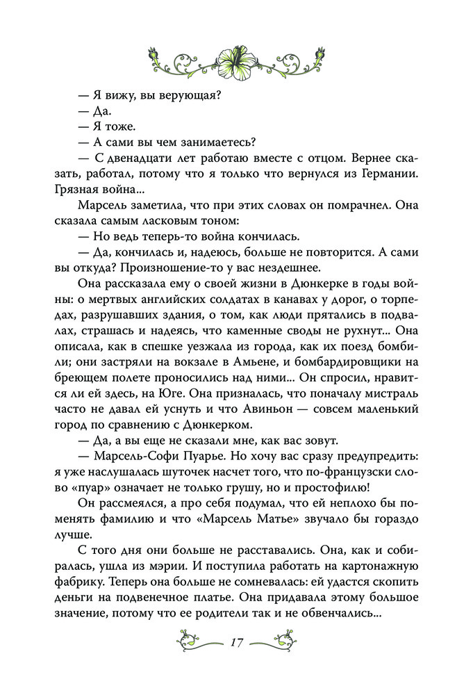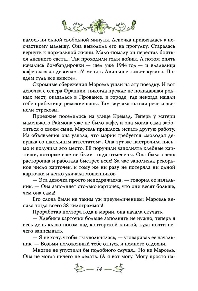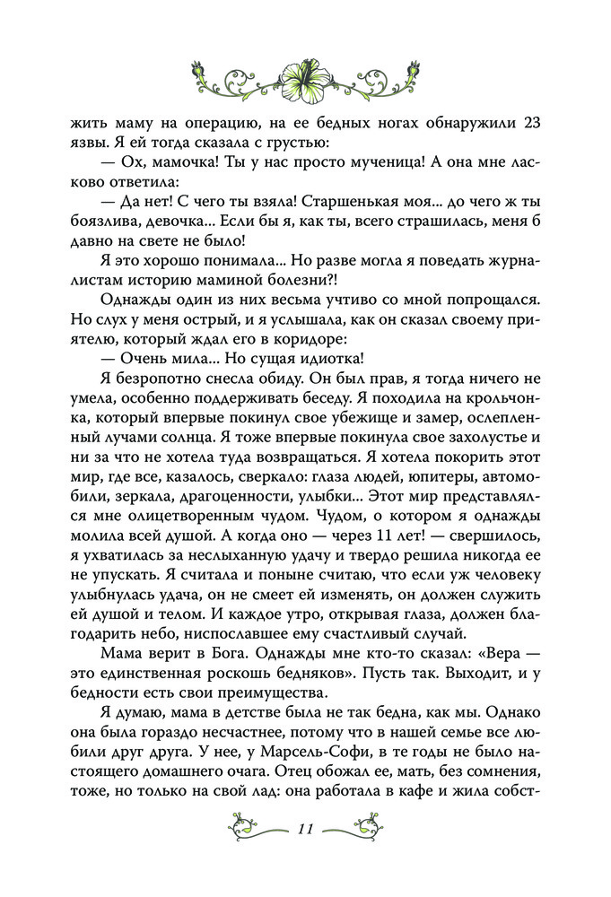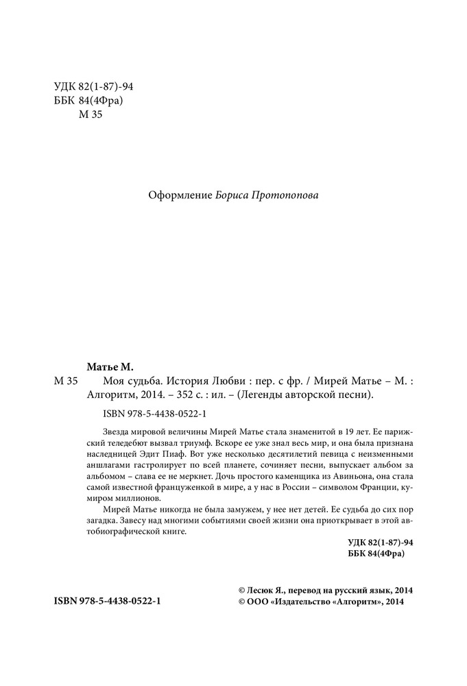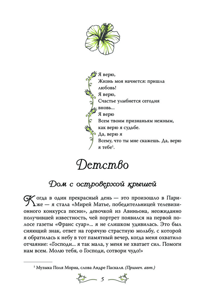 Замечательная книга. Мирей пишет сама, от первого лица, очень просто, понятно и красиво. Перевод очень хороший, без шероховатостей. В книге много интересного о Франции, начиная с послевоенного времени, о музыкальной сцене и т.д. Будет интересна всем поклонникам творчества Мирей Матье