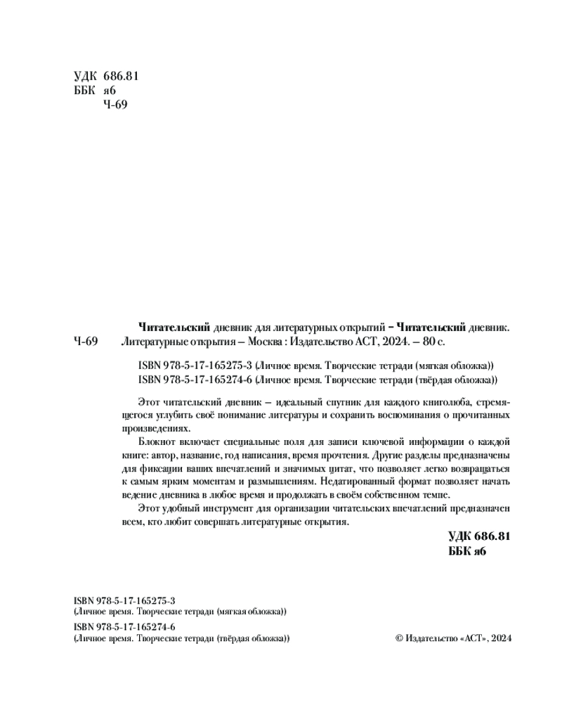 Серия: Личное время. Творческие тетради (твёрдая обложка) Этот читательский дневник — идеальный спутник для каждого книголюба, стремящегося углубить своё понимание литературы и сохранить воспоминания о прочитанных произведениях. |
