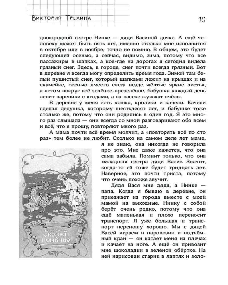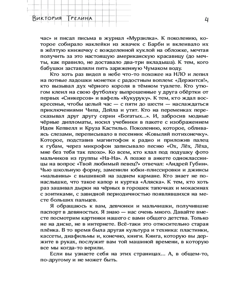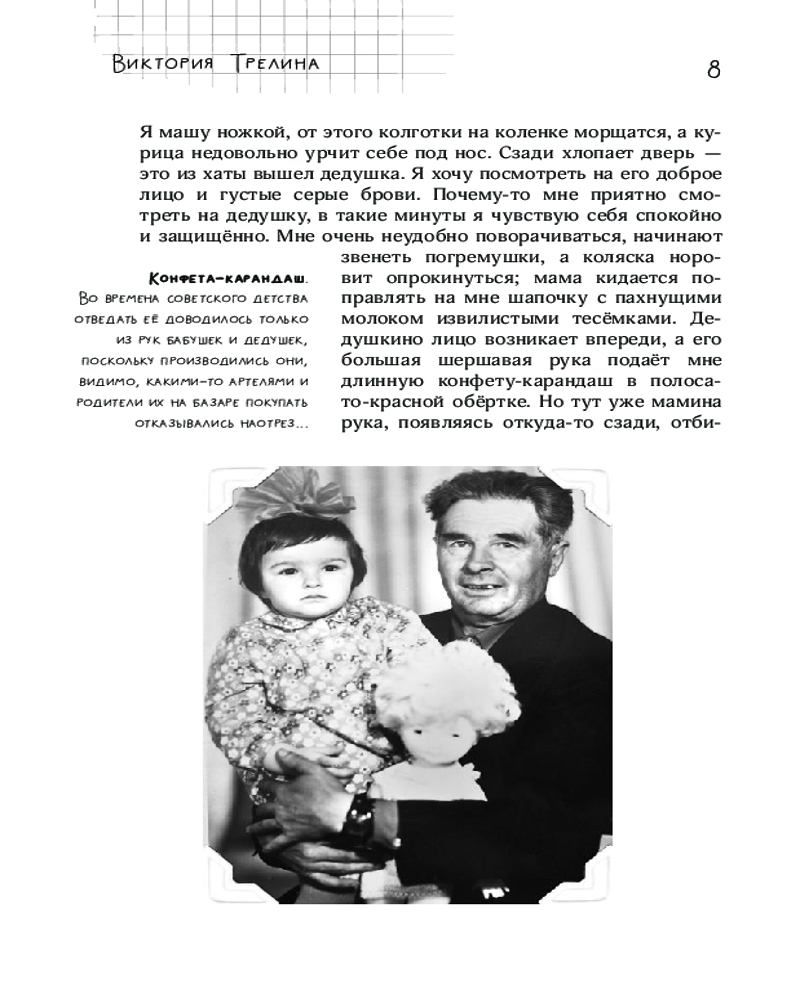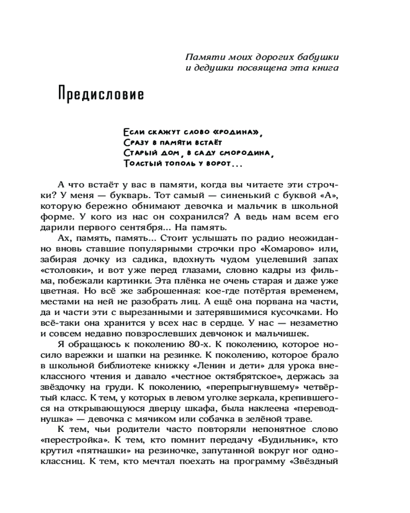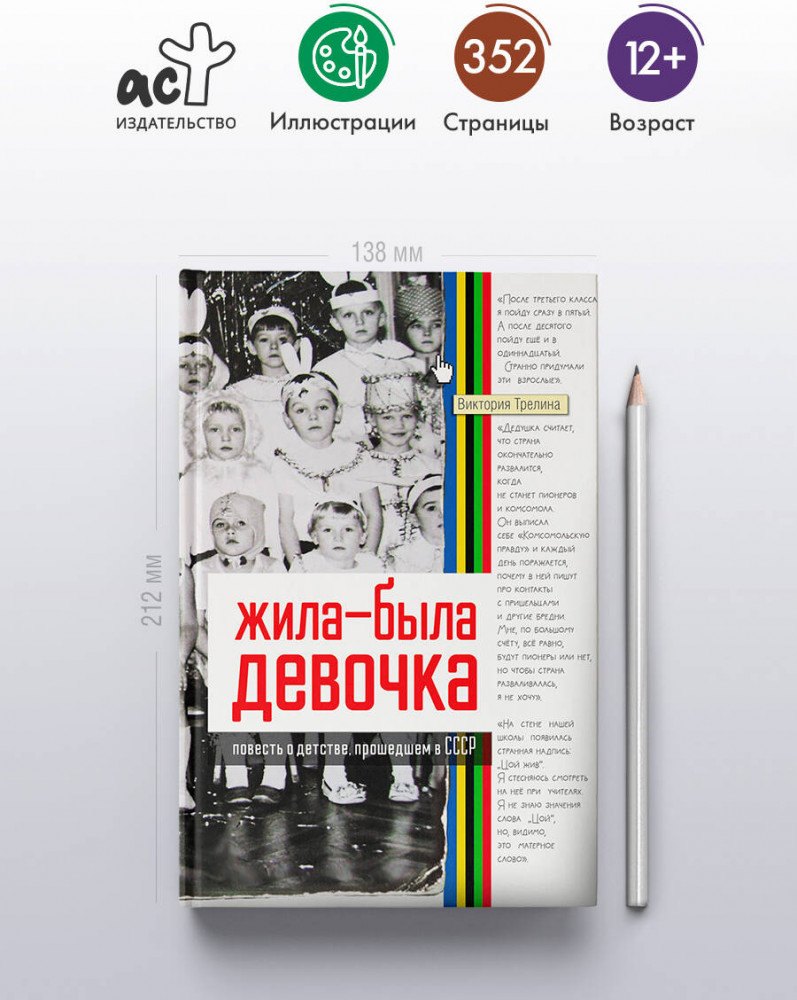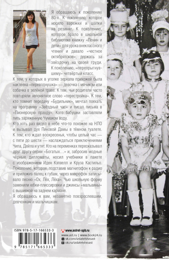 Серия: Жила-была девочка Невероятная по доброте и искренности ностальгическая повесть о тех, чья жизнь началась в год, когда навсегда улетел олимпийский мишка, и чьё детство закончилось слишком рано — когда не стало страны, в которой они родились. Это не просто рассказ о людях и вещах из прошлого, а очень интимный взгляд человека в то время, когда были живы бабушка и дедушка, когда мама была молодой и самой красивой, а жизнь была простой — и казалась бесконечной... Книга снабжена комментариями и иллюстрациями, которые помогут ещё глубже окунуться в атмосферу середины 80-х — начала 90-х. «Я обращаюсь к поколению 80-х. К поколению, которое брало в школьной библиотеке книжку „Ленин и дети“ и давало „честное октябрятское“, держась за звёздочку на своей груди. К тем, кто помнит передачу „Будильник“, мечтал поехать на программу „Звёздный час“ и писал письма в „Пионерскую правду“. К тем, чьи родители часто повторяли непонятное слово „перестройка“. Кого бабушки заставляли пить заряженную Чумаком воду. Чью школьную форму заменили юбки-плиссировки и джинсы „мальвины“. Я обращаюсь к вам, незаметно повзрослевшим девчонкам и мальчишкам». |