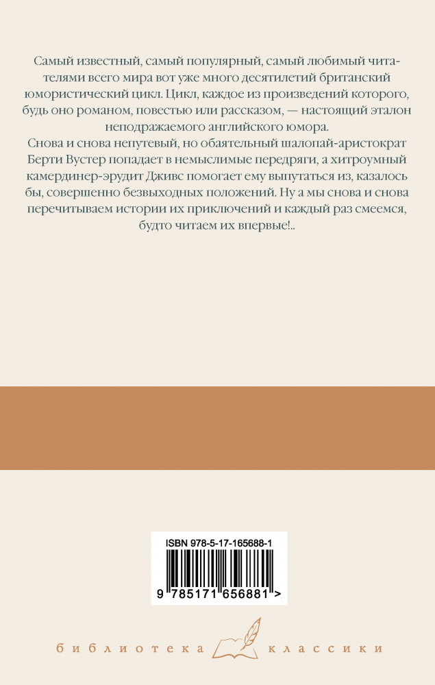 На выручку юному Гасси. Этот неподражаемый Дживс. Вперед, Дживс! Посоветуйтесь с ДживсомВ данный момент этот товар отсутствует в продаже. Возможно, у нас найдется аналогичный или похожий товар здесь. Серия: Библиотека классики Самый известный, самый популярный, самый любимый читателями всего мира вот уже много десятилетий британский юмористический цикл. Цикл, каждое из произведений которого, будь оно романом, повестью или рассказом, — настоязий эталон неподражаемого английского юмора. Снова и снова непутевый, но обаятельный шалопай-аристократ Берри Вустер попадает в немыслимые передряги, а хитроумный камердинер-эрудит Дживс помогает ему выпутаться из, казалось бы, совершенно безвыходных положений. Ну а мы снова и снова перечитываем истории их приключений и каждый раз смеемся, будто читаем их впервые!.. |