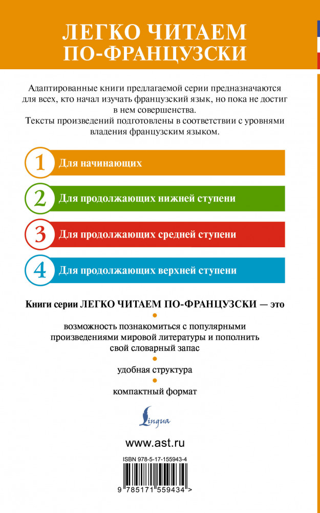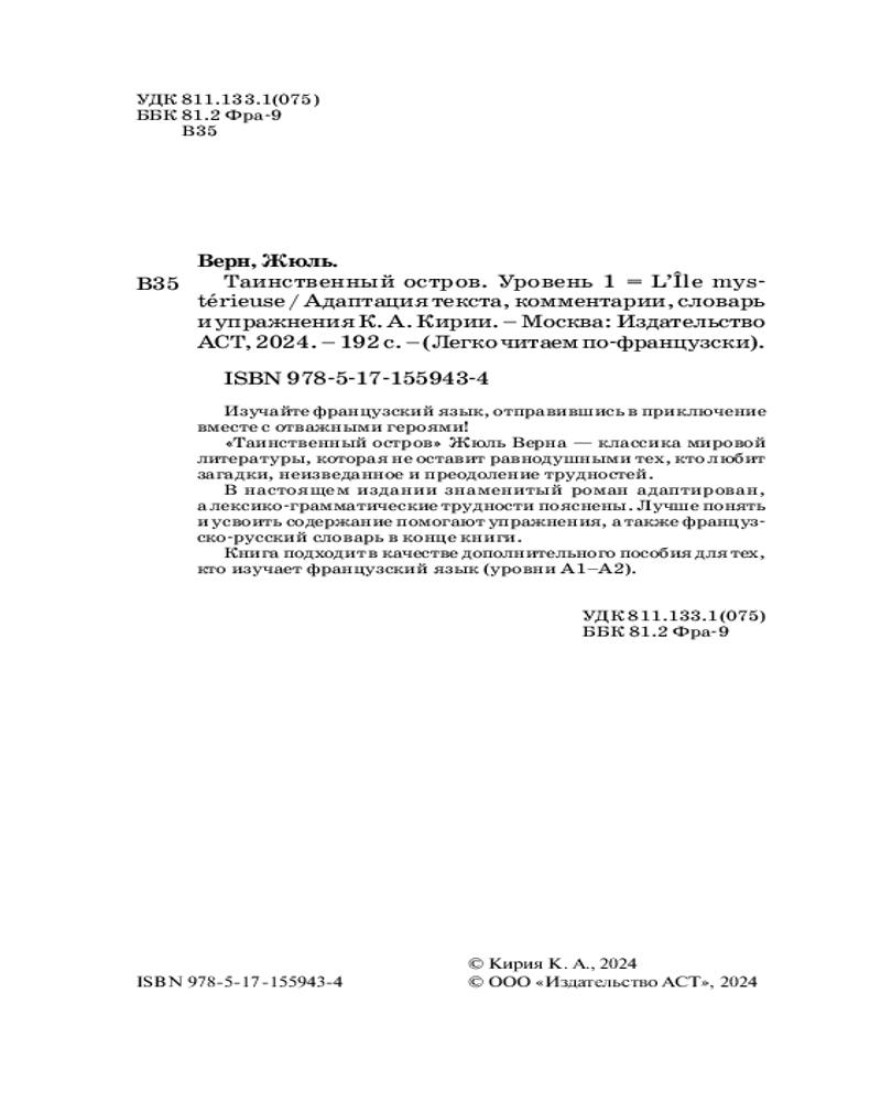 💳 Оплатить за товар можно при получении 🇰🇿 Есть бесплатная доставка по Казахстану от 1 дня 🎁 Копите бонусы с каждой покупки Серия: Легко читаем по-французски Изучайте французский язык, отправившись в приключение вместе с отважными героями! «Таинственный остров» Жюль Верна — классика мировой литературы, которая не оставит равнодушными тех, кто любит загадки, неизведанное и преодоление трудностей. В настоящем издании знаменитый роман адаптирован, а лексико-грамматические трудности пояснены. Лучше понять и усвоить содержание помогают упражнения, а также французско-русский словарь в конце книги. Книга подходит в качестве дополнительного пособия для тех, кто изучает французский язык (уровни A1—A2). |
