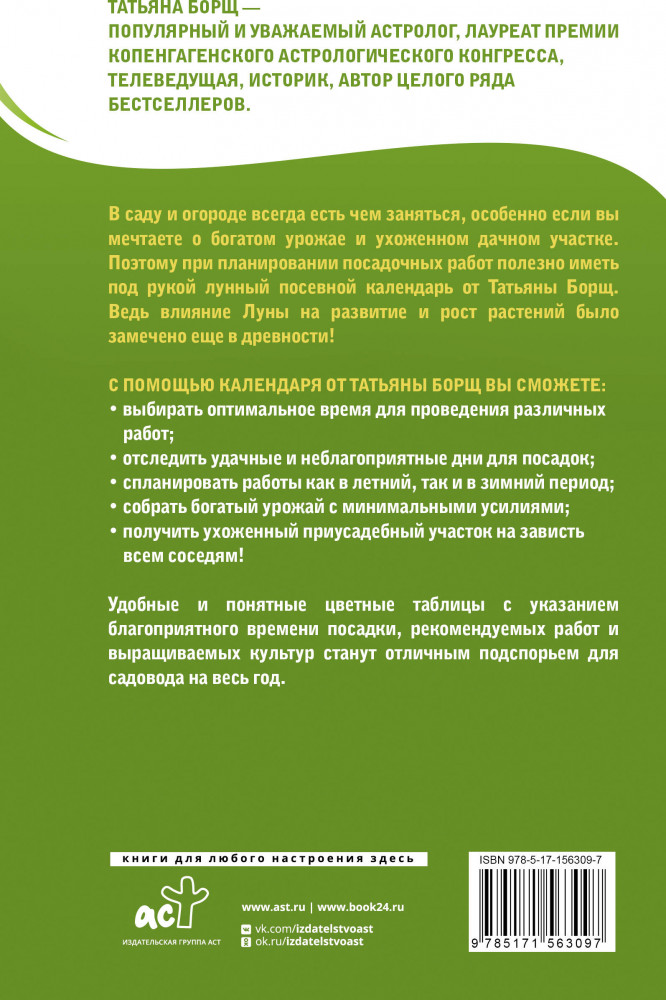 Серия: Борщ. Календари 2025 В саду и огороде всегда есть чем заняться, особенно если вы мечтаете о богатом урожае и ухоженном дачном участке. Поэтому при планировании посадочных работ полезно иметь под рукой лунный посевной календарь от Татьяны Борщ. Ведь влияние Луны на развитие и рост растений было замечено еще в древности! |