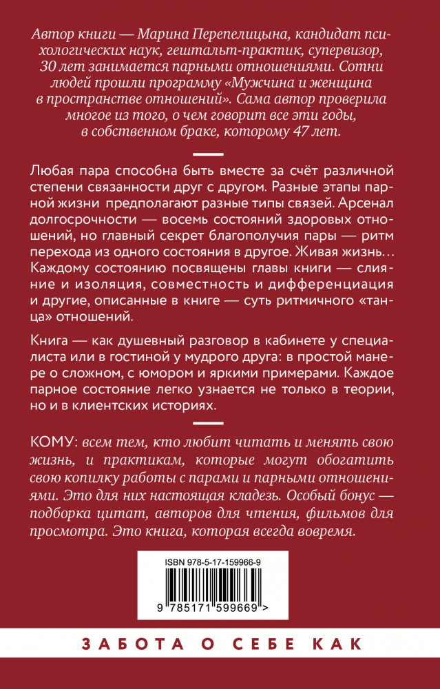 💳 Оплатить за товар можно при получении 🇰🇿 Есть бесплатная доставка по Казахстану от 1 дня 🎁 Копите бонусы с каждой покупки Серия: Уютная психология Любая пара может быть вместе за счет различной степени связанности друг с другом. Разные этапы парной жизни предполагают разные типы связей. Арсенал долгосрочности — восемь состояний здоровых отношений, но главный секрет благополучия пары — ритм перехода из одного состояния в другое. Живая жизнь... Каждому состоянию посвящены главы книги — слияние и изоляция, совместность и дифференциация и другие, описанные в книге — суть ритмичного «танца» отношений. |