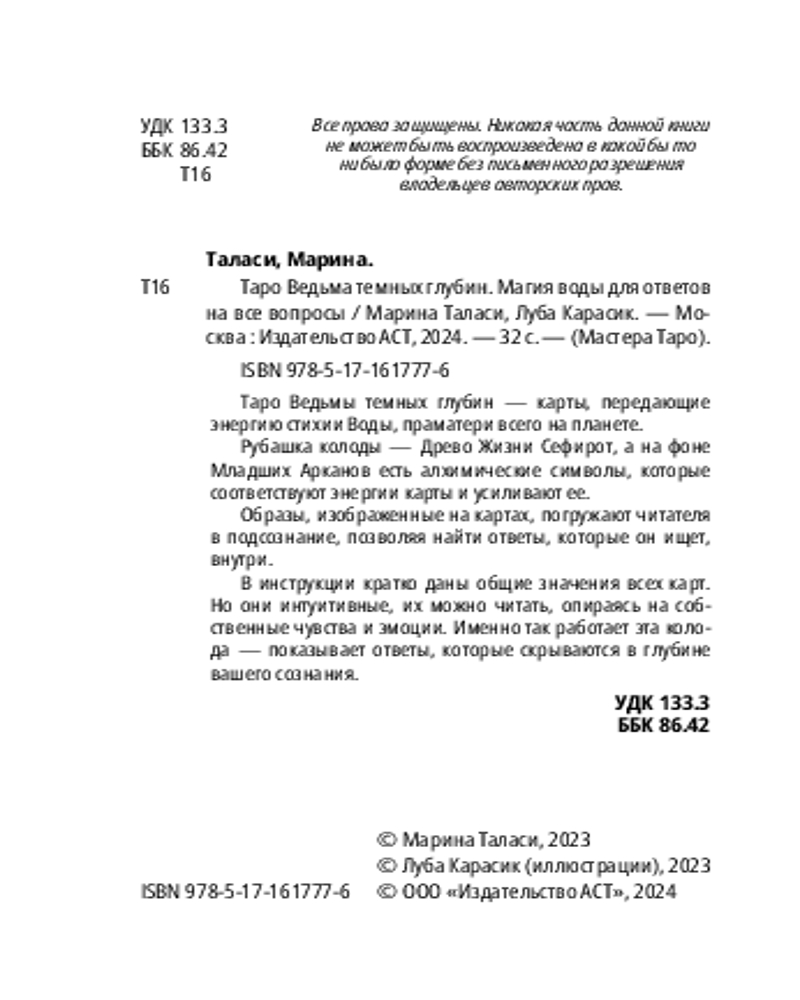 💳 Оплатить за товар можно при получении 🇰🇿 Есть бесплатная доставка по Казахстану от 1 дня 🎁 Копите бонусы с каждой покупки Серия: Мастера Таро (Коробка с картами + руководство) Уникальное авторское Таро в стиле темного фэнтези. Возьмите морскую ведьму за руку и погрузитесь в глубины собственного подсознания! Особенность Таро «Ведьма темных глубин» в том, что оно работает с энергиями бессознательного — с эмоциями, образами, чувствами, которые находятся глубоко внутри, скрываясь от «взгляда» вашего сознания. Колода построена по системе А. Уэйта и точно ответит на любой вопрос. В руководстве вы найдете значение каждой карты в раскладах на любовь, деньги, здоровье и отношения. Но это Таро намного глубже и создано не только для гадания. Оно поможет раскрыть вашу внутреннюю магию! Художница — Луба Карасик, автор иллюстраций к известным колодам «Таро Зеленой магии» и «Таро Зеленого пути». В колоде 78 карт и небольшая инструкция на 32 стр. Все упаковано в удобный футляр под размер карт. Колода также издается в большой коробке с подробным руководством — под названием «Таро Сердце ведьмы. Магия Великого Океана». |