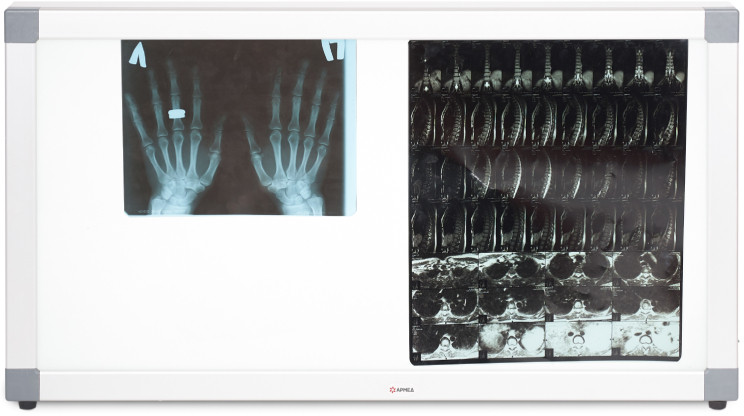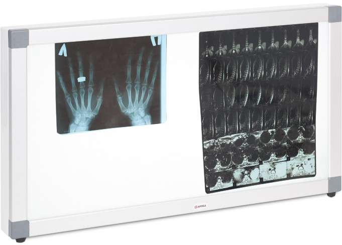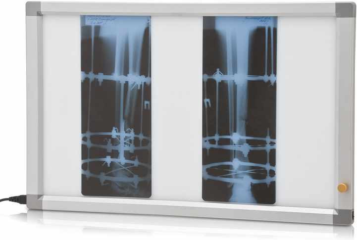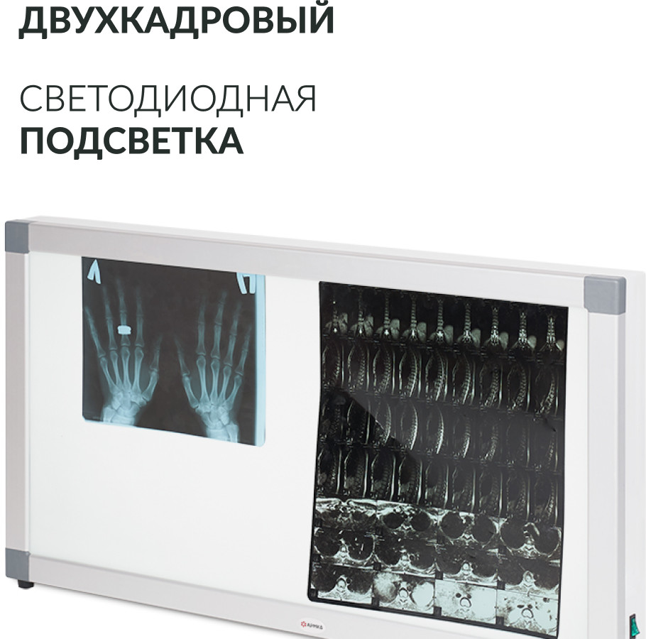 Негатоскоп общего назначения Армед 2-кадровый — медицинский прибор для быстрого просмотра 1-2 сухих рентгенограмм, оборудованный светодиодным источником освещения. Внутри корпуса установлены светодиодные линейки, которые обеспечивают высокую яркость свечения. Смотровой экран из прочного акрилового стекла молочно-белого цвета равномерно рассеивает свет. Рентгеновские снимки устанавливают в специальные пазы — надежная фиксация обеспечивает удобный просмотр.
