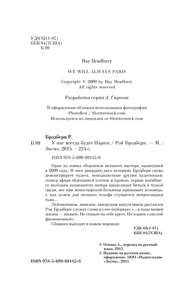 "Каждую неделю, каждый год видишь массу людей, и большинству из них суждено кануть в забытье. Единственное, что остается на потом, - это оглядываться на смутные мгновения тех лет и вспоминать, где твоя жизнь мельком коснулась жизни другого." Рэй Брэдбери, "Когда пересекаются пути" "У нас всегда будет Париж" Рэя Брэдбери - отличный сборник рассказов. Интересные, остроумные, ироничные, ностальгические, с налетом легкой грусти, пронзительные, поучающие. Каждый рассказ - полноценная история, на основе которой можно смело ставить фильм. Читается очень быстро и легко, мыслей для размышления оставляет массу, впрочем, как и любое произведение Брэдбери.