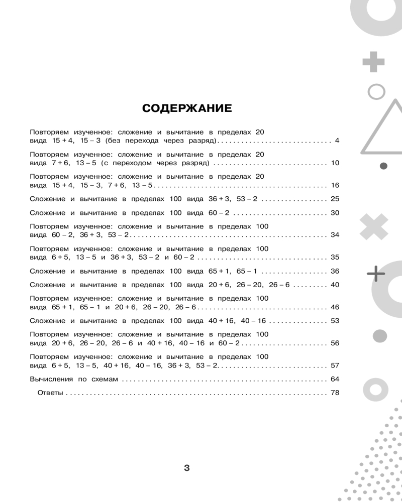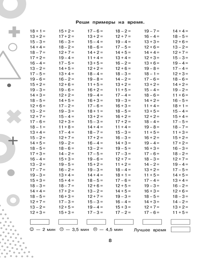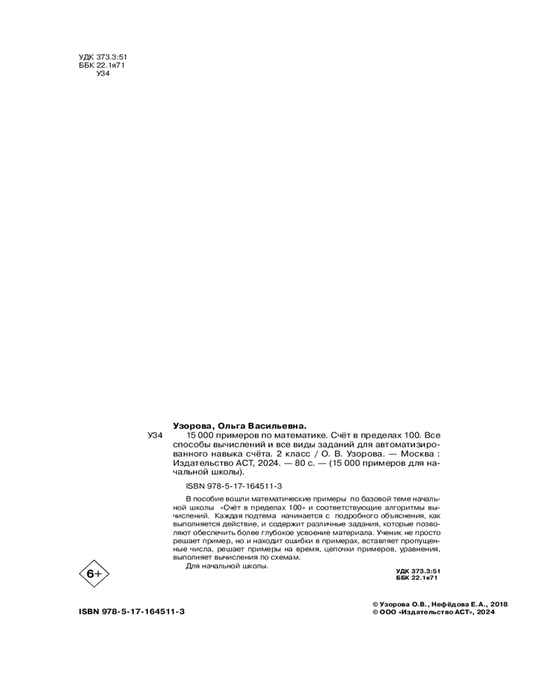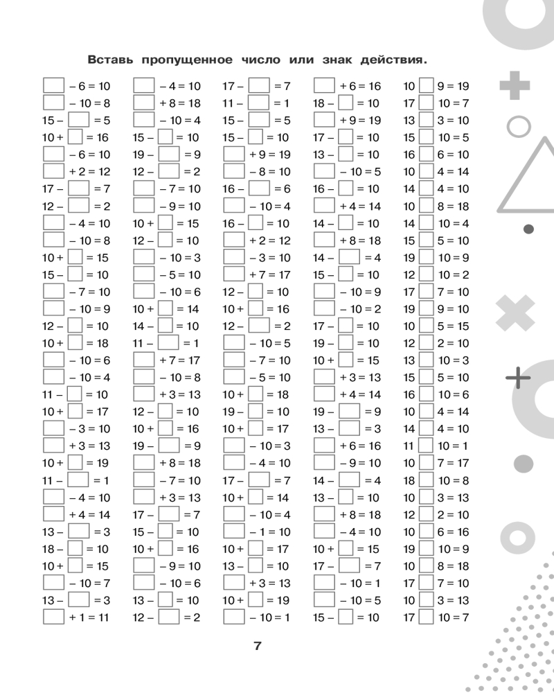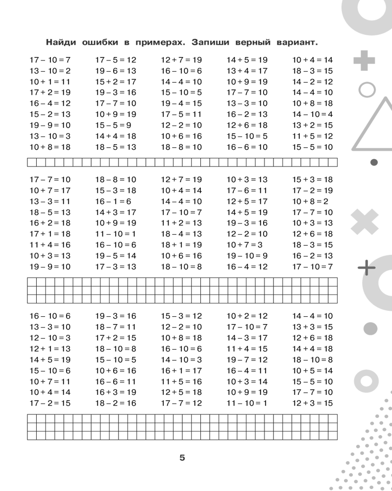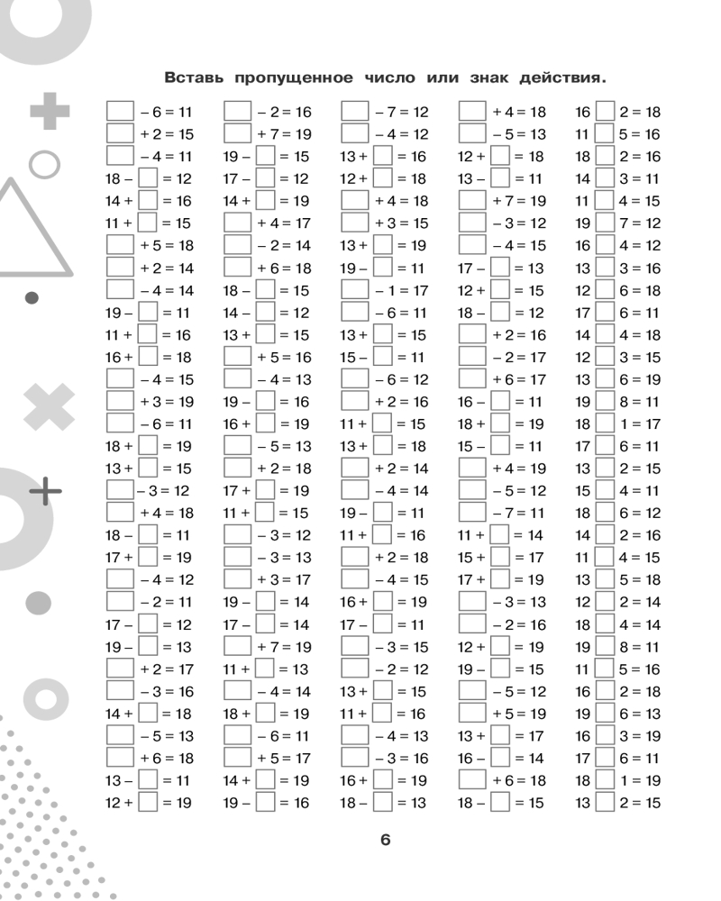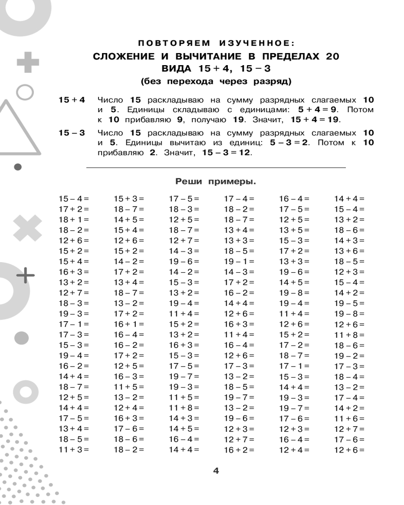 💳 Оплатить за товар можно при получении 🇰🇿 Есть бесплатная доставка по Казахстану от 1 дня 🎁 Копите бонусы с каждой покупки Серия: 15000 примеров для начальной школы В пособие вошли математические примеры по базовой теме начальной школы «Счёт в пределах 100» и соответствующие алгоритмы вычислений. Каждая подтема начинается с подробного объяснения, как выполняется действие, и содержит различные задания, которые позволяют обеспечить более глубокое усвоение материала. Ученик не просто решает пример, но и находит ошибки в примерах, вставляет пропущенные числа, решает примеры на время, цепочки примеров, уравнения, выполняет вычисления по схемам. Для начальной школы. |