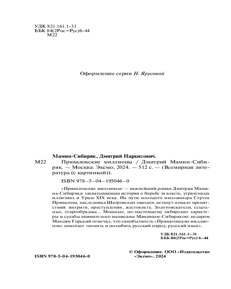 💳 Оплатить за товар можно при получении 🇰🇿 Есть бесплатная доставка по Казахстану от 1 дня 🎁 Копите бонусы с каждой покупки Серия: Всемирная литература (новое оформление) «Приваловские миллионы» — важнейший роман Дмитрия Мамина-Сибиряка: захватывающая история о борьбе за власть, утраченных иллюзиях и Урале XIX века. На пути молодого миллионера Сергея Привалова, наследника Шатровских заводов, встанет немало препятствий: интриги, преступления, жестокость. Золотоискатели, ссыльные, старообрядцы... Мощные, по-настоящему сибирские характеры и судьбы внимательно выписаны Маминым-Сибиряком: недаром Максим Горький отмечал, что самобытность «Приваловских миллионов» помогает «понять и полюбить русский народ, русский язык». |