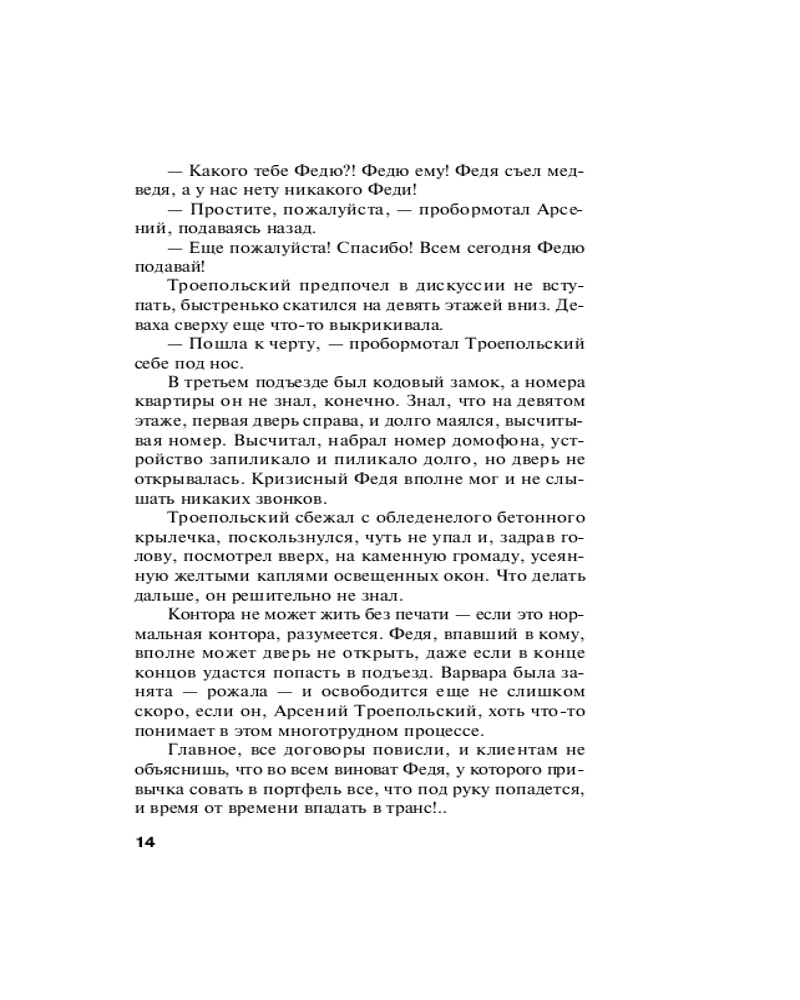 💳 Оплатить за товар можно при получении 🇰🇿 Есть бесплатная доставка по Казахстану от 1 дня 🎁 Копите бонусы с каждой покупки Серия: Столичный детектив. Новое оформление (обложка) Арсений Троепольский признавал в жизни только одно — работу. Она была его религией, его возлюбленной, его развлечением. Дизайнерская компьютерная фирма, которую он возглавлял, — процветала. И вот внезапно гром грянул среди ясного неба. Убили зама Троепольского, гения дизайна — Федора Грекова. Самое ужасное, что его труп нашел... Арсений. Отсидев три дня в кутузке как главный подозреваемый, он, наконец, появился в конторе, но возвращение к любимой работе не принесло радости. Пытаясь понять, кто и почему убил Федю, он обнаружил, что все вокруг лгут — сотрудники, любовница, сестра и племянница покойного. Но его мозг, работающий как компьютер, все разложил по полочкам. И гора лжи рухнула и погребла под собой всех "достойных«... |