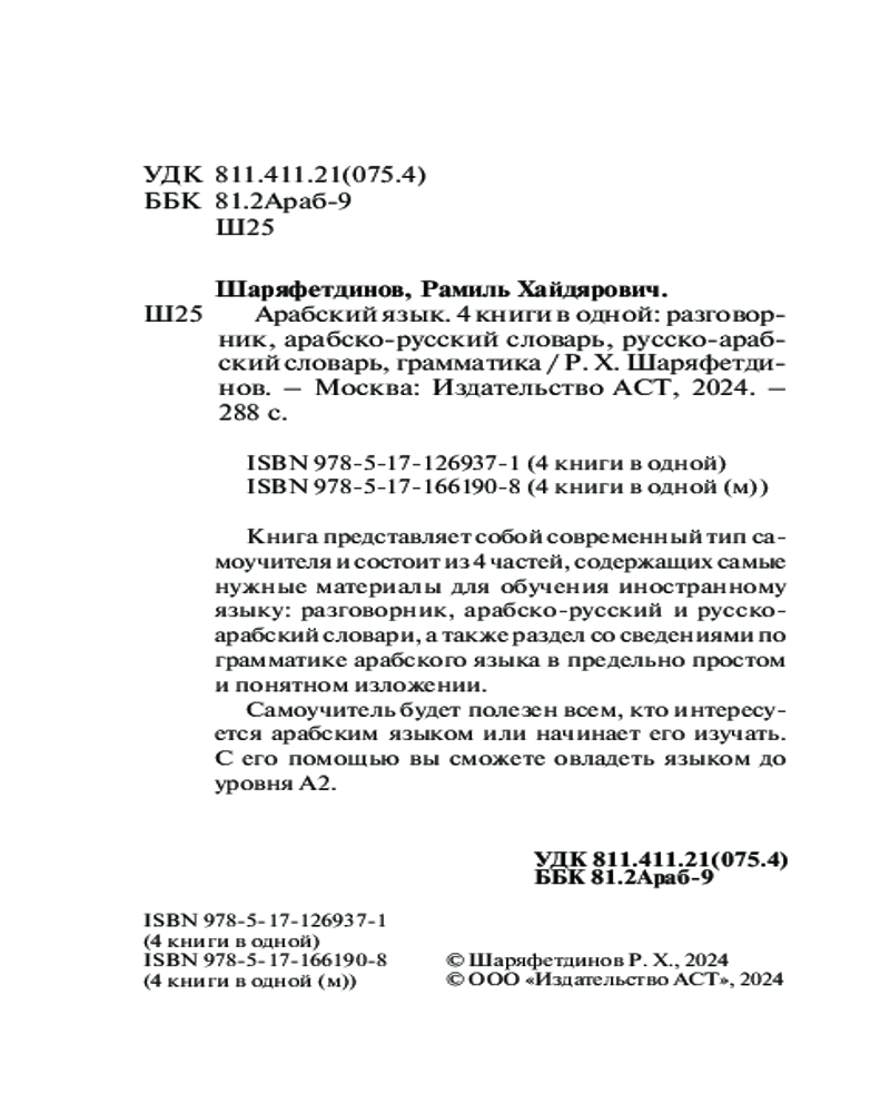 Арабский язык. 4 книги в одной: разговорник, арабско-русский словарь, русско-арабский словарь, грамматикаРамиль Хайдярович Шаряфетдинов В данный момент этот товар отсутствует в продаже. Возможно, у нас найдется аналогичный или похожий товар здесь. Серия: 4 книги в одной (м) Книга представляет собой современный тип самоучителя и состоит из 4 частей, содержащих самые нужные материалы для обучения иностранному языку: разговорник, арабско-русский и русско-арабский словари, а также раздел со сведениями по грамматике арабского языка в предельно простом и понятном изложении. |