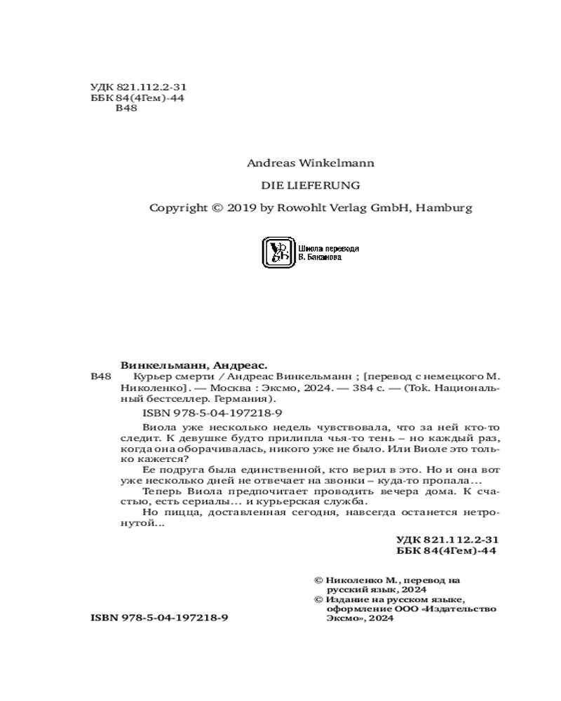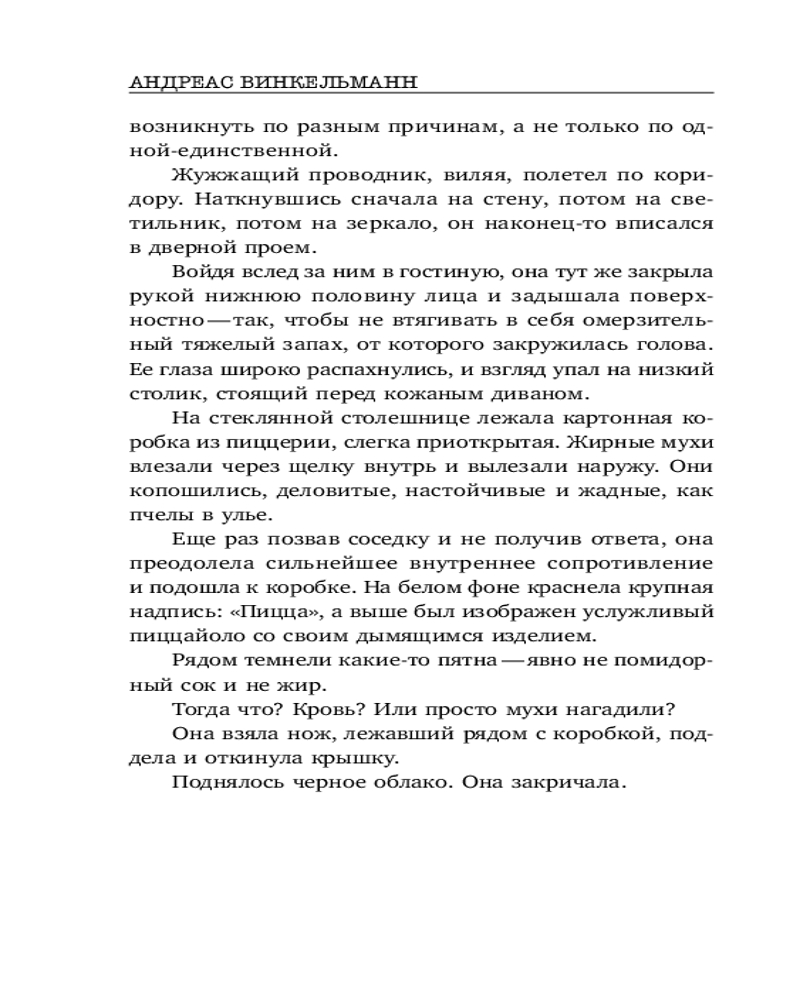 💳 Оплатить за товар можно при получении 🇰🇿 Есть бесплатная доставка по Казахстану от 1 дня 🎁 Копите бонусы с каждой покупки Серия: Tok. Национальный бестселлер. Германия Виола уже несколько недель чувствовала, что за ней кто-то следит. К девушке будто прилипла чья-то тень — но каждый раз, когда она оборачивалась, никого уже не было. Или Виоле это только кажется? Ее подруга была единственной, кто верил в это. Но и она вот уже несколько дней не отвечает на звонки — куда-то пропала... Теперь Виола предпочитает проводить вечера дома. К счастью, есть сериалы... и курьерская служба. Но пицца, доставленная сегодня, навсегда останется нетронутой... Андреас Винкельманн зарекомендовал себя одним из ведущих немецких авторов в жанре остросюжетной литературы. Написал более 20 романов, большая часть из которых стали национальными бестселлерами. |