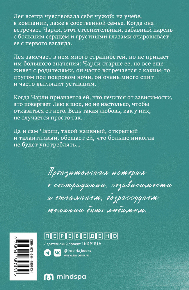 Серия: Переведено. Такова жизнь Лея всегда чувствовала себя чужой: на учебе, в компании, даже в собственной семье. Когда она встречает Чарли, этот стеснительный, забавный парень с большим сердцем и грустными глазами очаровывает ее с первого взгляда. Лея замечает в нем много странностей, но не придает им большого значения: Чарли старше ее, но все еще живет с родителями, он часто встречается с каким-то другом под покровом ночи, он очень много спит и часто выглядит уставшим. |