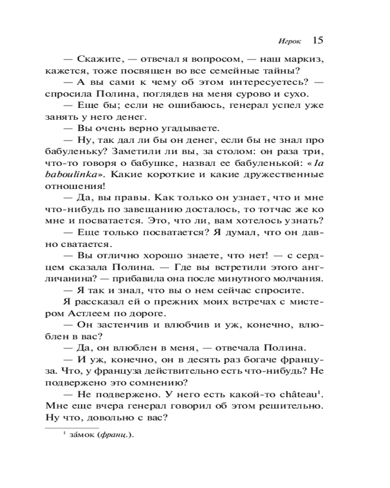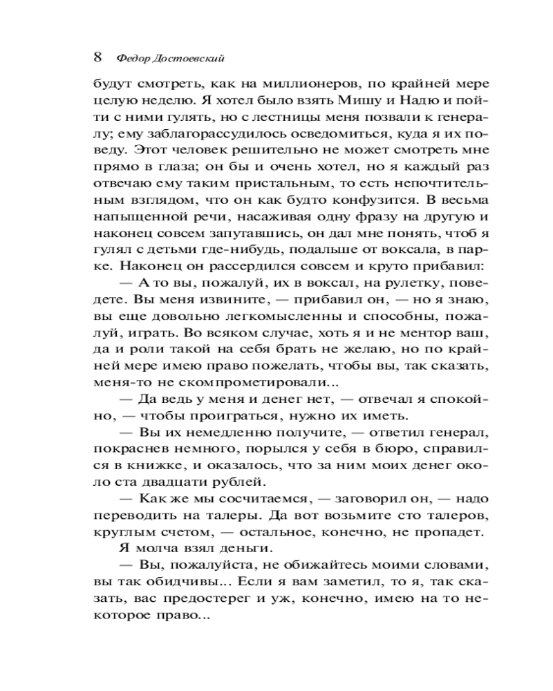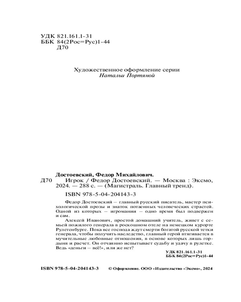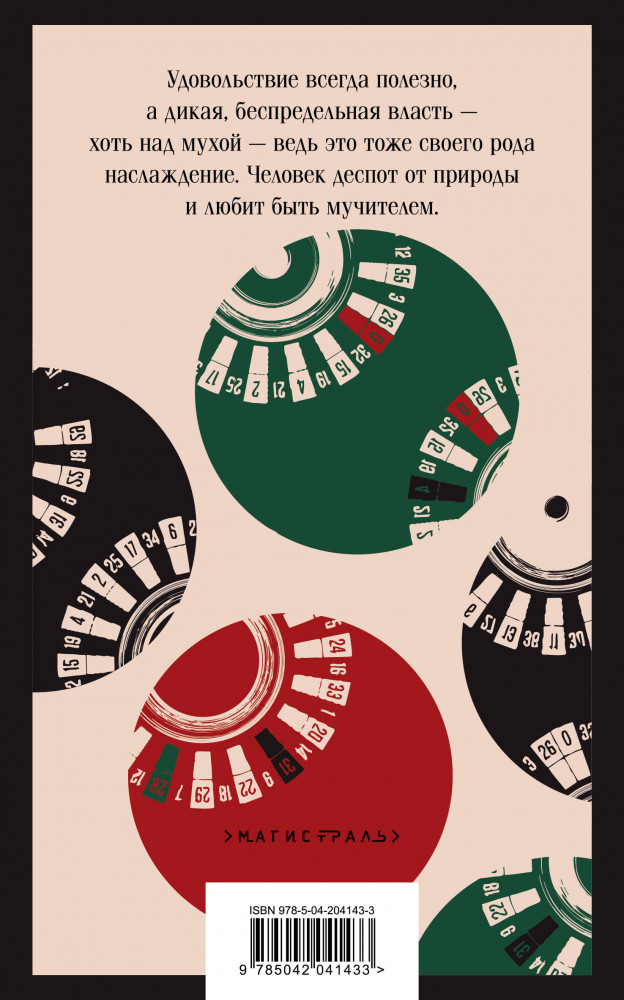 💳 Оплатить за товар можно при получении 🇰🇿 Есть бесплатная доставка по Казахстану от 1 дня 🎁 Копите бонусы с каждой покупки Серия: Магистраль. Главный тренд Федор Достоевский — главный русский писатель, мастер психологической прозы и знаток потаенных человеческих страстей. Одной из которых — игромании — одно время был подвержен и сам. Алексей Иванович, простой домашний учитель, живет с семьей пожилого генерала в роскошном отеле на немецком курорте Рулетенбурге. Пока все господа ждут смерти богатой русской тетки генерала, чтобы получить наследство, главный герой втягивается в мучительные любовные отношения, в основе которых лишь гордыня и расчет. Он отчаянно испытывает судьбу и удачу в рулетке. Ведь «деньги — всё!». Или же нет? |