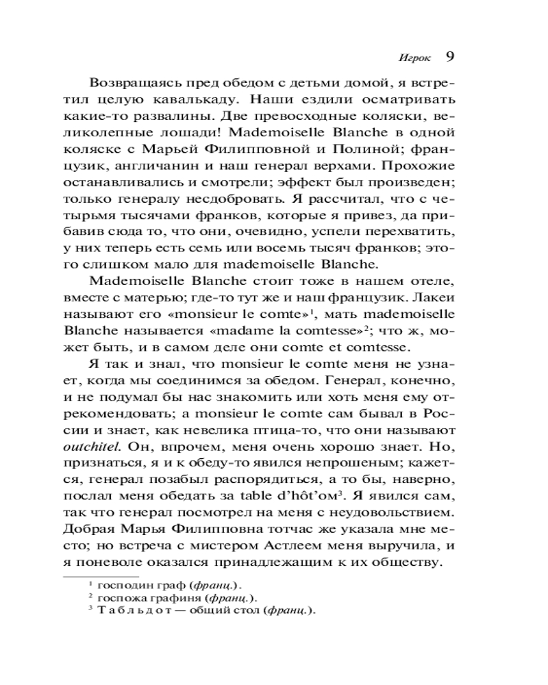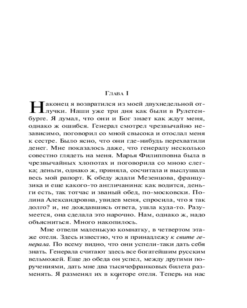Сюжет «Игрока» тягучий, медленный и зыбок, как болото. Молодой учитель влюблен в падчерицу своего нанимателя - Полину. Вокруг нее крутятся женихи, это и француз де Грие, и англичанин Астлей. Где-то рядом с ними стоит напыщенный генерал, который является отчимом Полины, а также «дама его сердца» - мадам Бланш (не знаю, что там с сердцем, но кроме денежных знаков её мало что интересует). Все они замерли в ожидании - вот-вот должна умереть бабушка из России, которая оставит приличное наследство... И единственное, что оживляет это болото - приезд этой самой бабушки, которая умирать пока вовсе не планирует. С этого момента интрига раскручивается со скоростью света. На самом деле, ничего неожиданного тут нет, событий немного. Но тут важно другое - мастерство Достоевского в описании характеров, поступков, страстей. Герои. Не самые симпатичные люди из тех, что вы встречали. Скажем прямо. Личности специфические. Ведь все они - игроки. Заядлые игроки. И ведомы лишь азартом и верой в благосклонность Фортуны. Абсолютно каждый из них. Это и генерал, который влюбился на старости лет, в пух и прах все проиграл и постоянно боится потерять "лицо". И де Грие с Бланш - играют людскими жизнями без сомнения ради финансовых выгод. И бабушка, которая долго разглагольствовала о построение церкви, но проигравшая все деньги за один день. И главный герой Алексей Иванович, для которого в итоге игра в рулетку становится смыслом всего сущего... Достоевский подробно описал, как образованный человек превратился в раба Игры. Шаг за шагом игра затягивает, отнимает силу воли, разрывает связь с внешним миром. Человек существует (не живет, именно существует) словно в дурном, наркотическом сне, где ничего уже не имеет значения, а вся жизнь сосредоточена вокруг и для рулетки, и ради одурманивающего чувства азарта. Выпутаться невозможно, герою не хватает силы воли для этого, он тонет и пучина Игры засасывает его всё глубже. От этого жизненные перипетии самого автора и то, как он сумел перешагнуть через них, вызывает безмерное уважение, ведь если бы он не поборол этот недуг, вполне возможно, мир не увидел бы его последующих литературных шедевров. Странной мне показалась Полина. Наверное, она единственная не играла в рулетку...Но непонятно, плюс ли это. Нервная, истеричная и высокомерная особа, которую понять категорически невозможно… Невероятная самовлюбленность и стервозность, проявляющая себя даже в мелочах, делает её едва ли не самым отталкивающим персонажем книги. Определенно в плюс книге идёт и то, что времена меняются - а вот хомо сапиенсы нет (и Достоевский это очень хорошо показывает). Мы видим всю изнанку дворянства того времени. И если проводить параллель с современностью - не сказать, что многое изменилось. Ну, разве, что декорации, да и полное отсутствие, пусть и показной, морали. Циничность 21 столетия убрала ширму морали за полной ненадобностью (немного забавно, что при прочтении произведений Федора Михайловича мне чаще всего хочется переслушивать трек Эннио Морриконе «Morale» из старенького, но по-прежнему прекрасного сериала «La Piovra»). «Игрок» вполне может вызвать ассоциацию с «Пиковой дамой» Пушкина. Игровой азарт, внезапно полностью поглощающий только что безучастных героев, едва они сделают первую ставку. Это словно море, волны которого кажутся не такими уж большими, пок