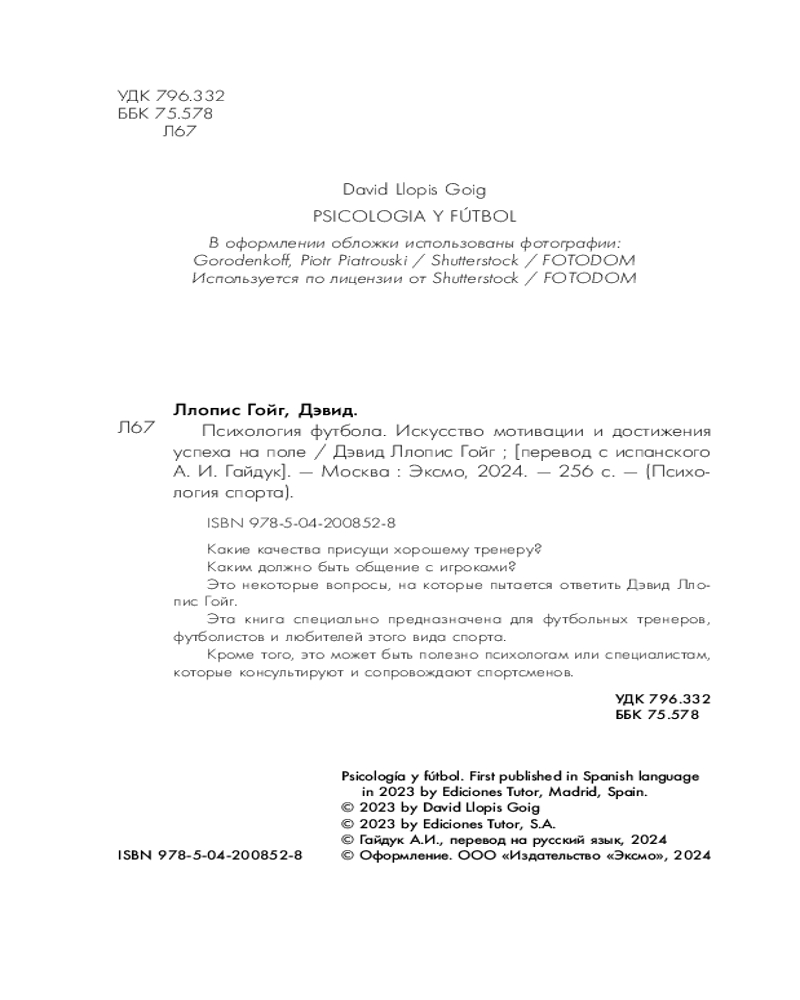 💳 Оплатить за товар можно при получении 🇰🇿 Есть бесплатная доставка по Казахстану от 1 дня 🎁 Копите бонусы с каждой покупки Серия: Психология спорта Какие качества присущи хорошему тренеру? Каким должно быть общение с игроками? Является ли лидерский потенциал тренера врожденным или его можно развивать? Как создать и возглавить сплоченную команду? Как узнать и понять игрока, чтобы помочь ему добиться максимальной производительности? Как управлять конкуренцией? Это некоторые вопросы, на которые пытается ответить Дэвид Ллопис Гойг. |