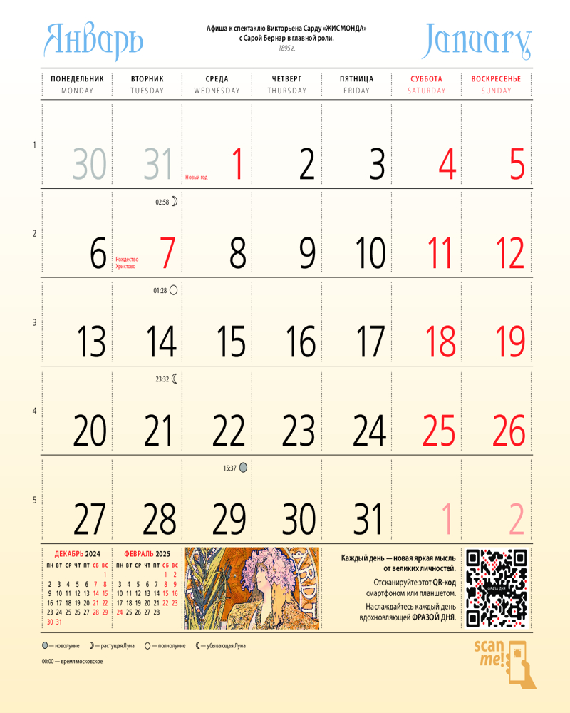 покупаю календарь с работами Альфонса Мухи каждый год. Прекрасные иллюстрации художника писавшего в стиле ар нуво. Рекомендую