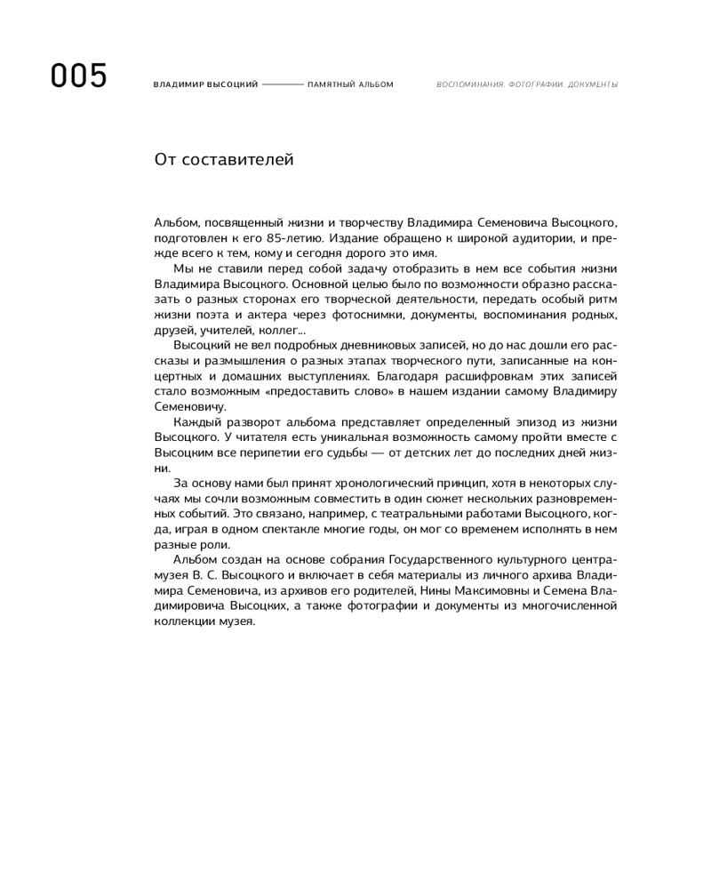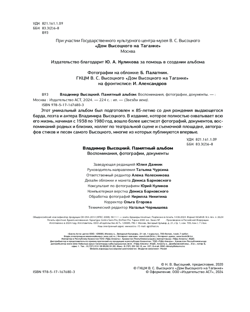 💳 Оплатить за товар можно при получении 🇰🇿 Есть бесплатная доставка по Казахстану от 1 дня 🎁 Копите бонусы с каждой покупки Серия: Звезды века (бол.) Этот уникальный альбом был подготовлен к 85-летию со дня рождения выдающегося барда, поэта и актера Владимира Высоцкого. В издание, которое полностью охватывает всю его жизнь, начиная с 1938 по 1980 год, вошло более шестисот фотографий, документов, воспоминаний родных и близких, коллег по театральной сцене и съемочной площадке, автографов стихов и песен самого Высоцкого, многие из которых публикуются впервые. |