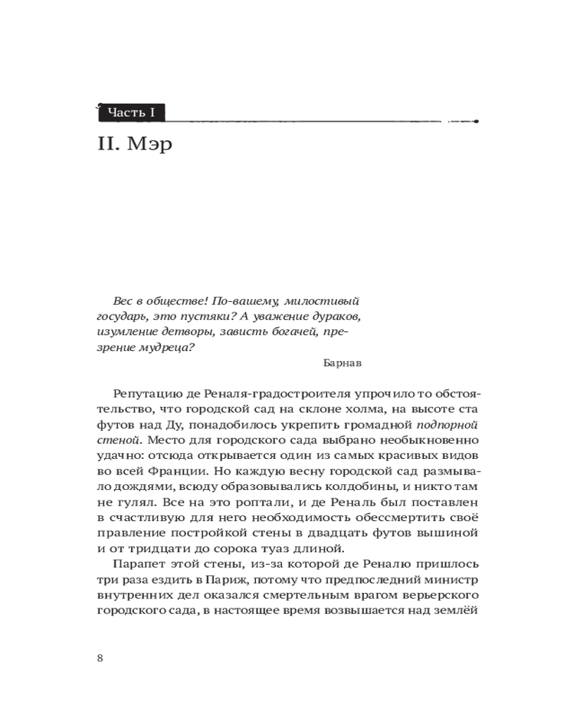 Опубликованный в 1830 году роман «Красное и Черное» берет за основу газетную статью, которую Стендаль прочитал в гренобльской газете. И уже с первых дней публикации роман неоднократно запрещали, обличали и многое другое (Оскар Уайльд со своим «Портретом Дориана Грея» понимающе кивает). Роман задел многих, и особенно людей обличенных властью. Оно и понятно. Стендаль нарисовал крайне неприятную картину высшего общества Франции 20-30-х гг. XIX века. Масла в огонь подливало и само название стендалевского романа, которое вызвало множество споров и недоумений — оно было глубоко новаторским. Во втором и третьем десятилетиях XIX века представители романтизма вводят в моду необычные и загадочные названия, однако, в отличие от стендалевского, они всегда объяснялись текстом, где в том или ином виде предлагалась их разгадка. В названии же стендалевского произведения содержится загадка без какой-либо разгадки. Просто «Красное и Черное». И всё тут. Впоследствии было выдвинуто немало гипотез, почему автор выбрал для романа такое название, но однозначного мнения на этот счёт в литературоведении не сформировалось и по сей день. Красное - чёрное можно трактовать и как символ двух карьер Сореля - военной и духовной, и как игру в рулетку, где красное - выигрыш, а чёрное - проигрыш. Игра постоянно присутствует в поведении ГГ, ибо ему почти всегда приходится надевать маску — лицемерить, играть роль, нередко на грани жизни и смерти. Да и вообще следует сказать, что тема игры, человеческих масок и вторых личностей станет постоянной в творчестве Стендаля именно после этого произведения. Также оппозиция «красное - черное» символизирует то внутреннее противоречие, которое переживает герой, а также его конфликт с миром. Если красный цвет — это, при определенном трактовании, радость, победа, красота, то чёрный цвет - это всегда и однозначно скорбь, одиночество, несчастье и смерть. Читатель волен выбирать сам, что ему ближе или прийти к своим собственным выводам. Стендаль загадал загадку, но такую, где любой ответ может быть верным или неверным в равной степени (в этот раз обойдусь без аналогий с двумя сторонами одной монеты, нувыпонели). А что же у нас там с самой историей? О, с историей полный порядок, поверьте мне. Восемнадцатилетний Жюльен Сорель - главный герой романа. Он хочет быть епископом, но жаждет только одного - привилегий, связанных с этой должностью. Сам он в Бога не верит. Жюльен беден и не имеет знатного происхождения, он - обыкновенный деревенский парень, и дорога на вершину пищевой цепочки для него закрыта (на первый взгляд…), однако он имеет целый ряд других козырей у себя в рукаве: острый ум, рассудительность, самодостаточность, высокая адаптивность к сложившимся обстоятельствам, немалый талант к тактическому и стратегическому мышлению (правда, в дальнейшем ситуативность и порывистость берут над ним верх, и Жюльен больше не способен просчитать «игру» даже на один ход вперёд), честолюбие, амбициозность (к сожалению, порой излишняя и подогреваемая его ненасытной гордыней), при этом он остаётся чувственным, эмоциональным, крайне обидчивым и многого непонимающим чисто в силу своего возраста. Он - Человек Идеи. Идейность его натуры может даже вызвать некое уважение, ибо Жюльен не просто словами, но и своими действиями показывает сколь многим он готов пож