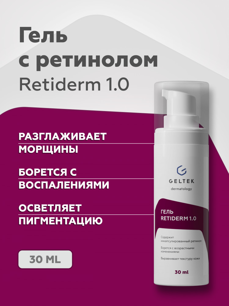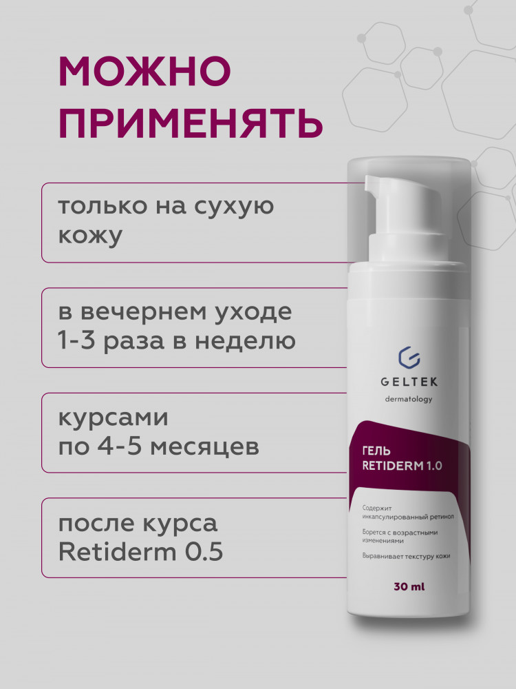 • при появлении раздражения/повышения чувствительности кожи при схеме нанесения через день возвращаться к схеме 2-х раз в неделю или реже. При использовании геля Retiderm 1.0 в дневное время необходимо наносить солнцезащитное средство с SPF 30 или 50;