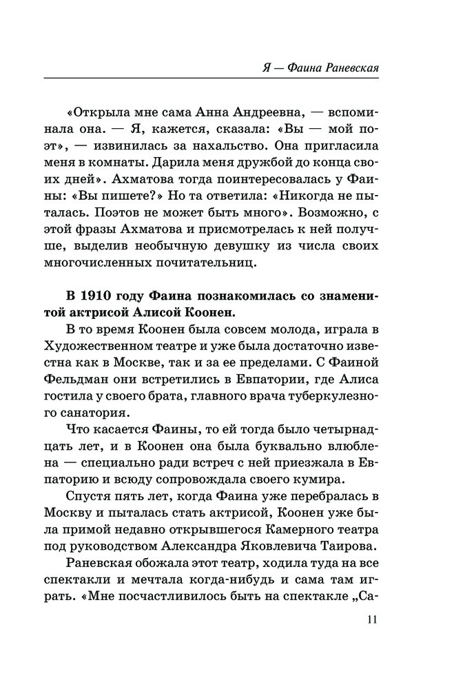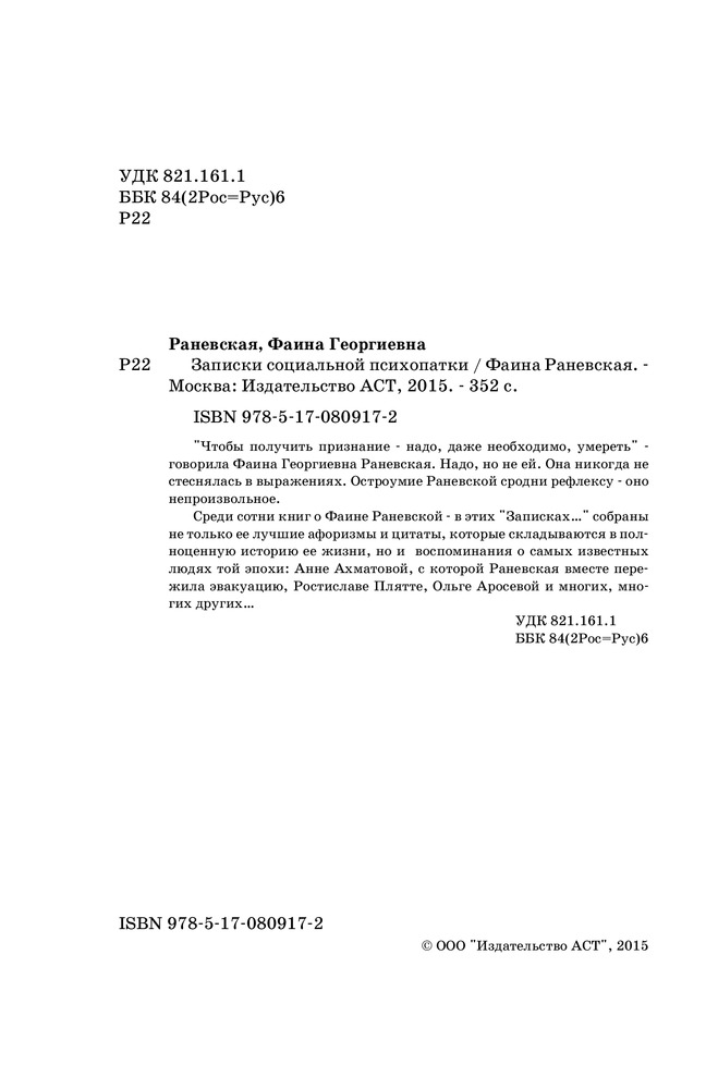 Среди сотни книг о Фаине Раневской — в этих «Записках…» собраны не только ее лучшие афоризмы и цитаты, которые складываются в полноценную историю ее жизни, но и воспоминания о самых известных людях той эпохи: Анне Ахматовой, с которой Раневская вместе пережила эвакуацию, Ростиславе Плятте, Ольге Аросевой и многих, многих других… |