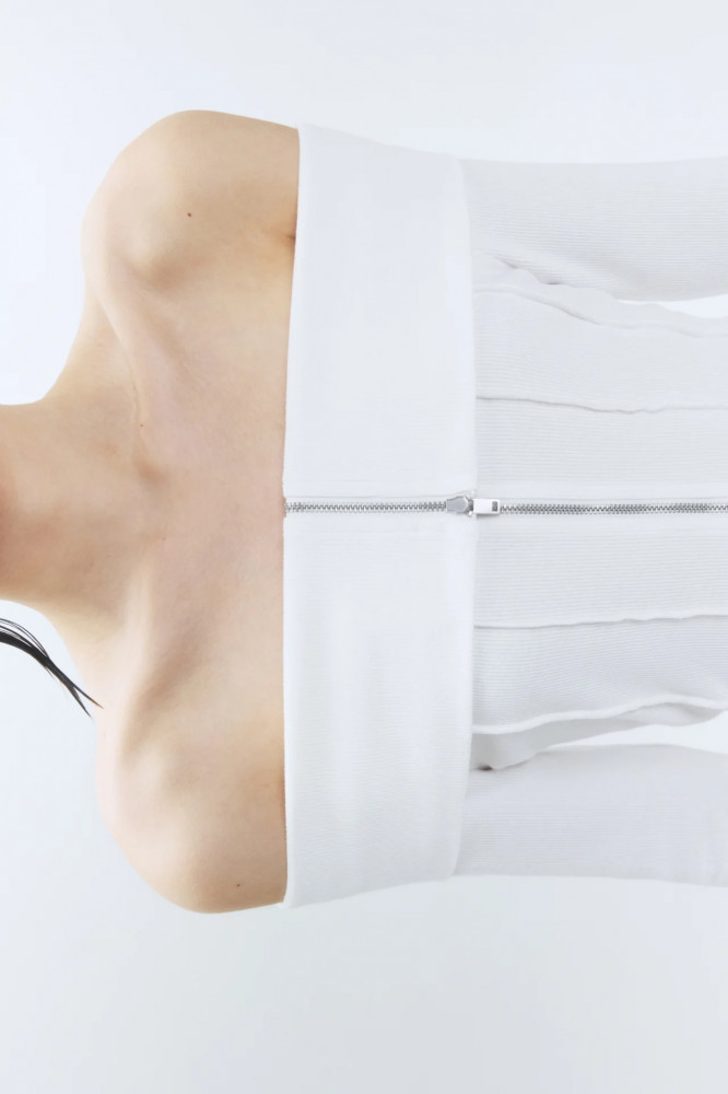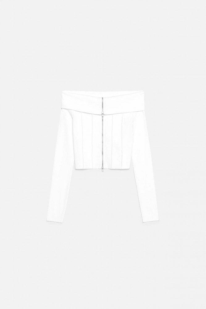 Короткая женская блузка-лонгслив облегающего кроя из мягкой, эластичной и очень приятной к телу смесовой ткани на основе хлопка. Вырез-хомут с открытыми плечами и широким отворотом. Длинные облегающие рукава с прямыми манжетами. Прямой нижний край без разрезов. Объемные декоративные швы спереди. Застежка на молнию по всей длине.