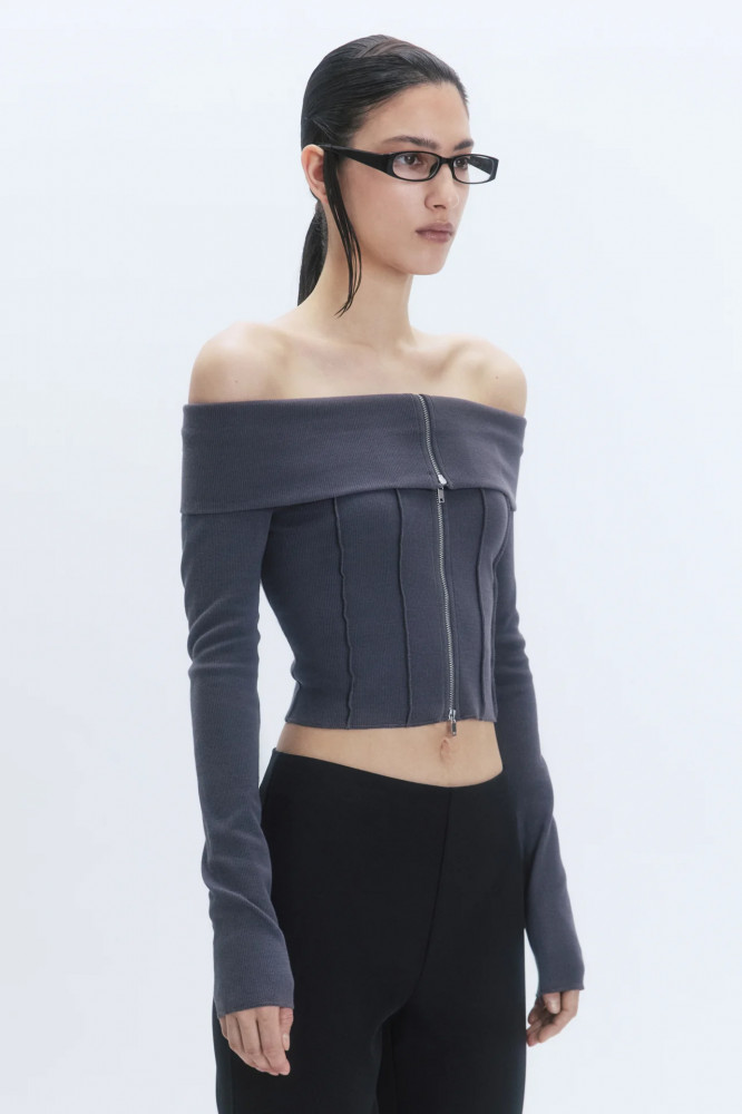 Короткая женская блузка-лонгслив облегающего кроя из мягкой, эластичной и очень приятной к телу смесовой ткани на основе хлопка. Вырез-хомут с открытыми плечами и широким отворотом. Длинные облегающие рукава с прямыми манжетами. Прямой нижний край без разрезов. Объемные декоративные швы спереди. Застежка на молнию по всей длине.