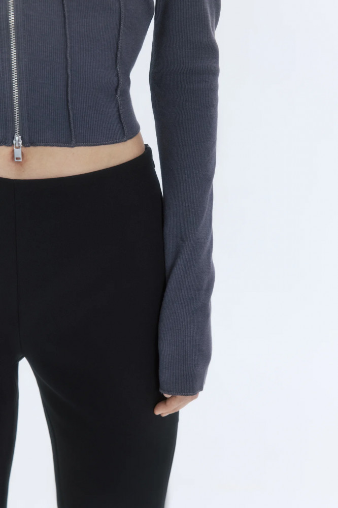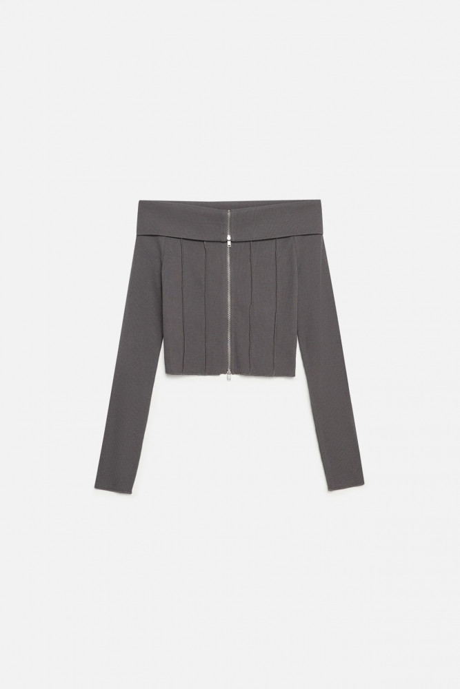 Короткая женская блузка-лонгслив облегающего кроя из мягкой, эластичной и очень приятной к телу смесовой ткани на основе хлопка. Вырез-хомут с открытыми плечами и широким отворотом. Длинные облегающие рукава с прямыми манжетами. Прямой нижний край без разрезов. Объемные декоративные швы спереди. Застежка на молнию по всей длине.