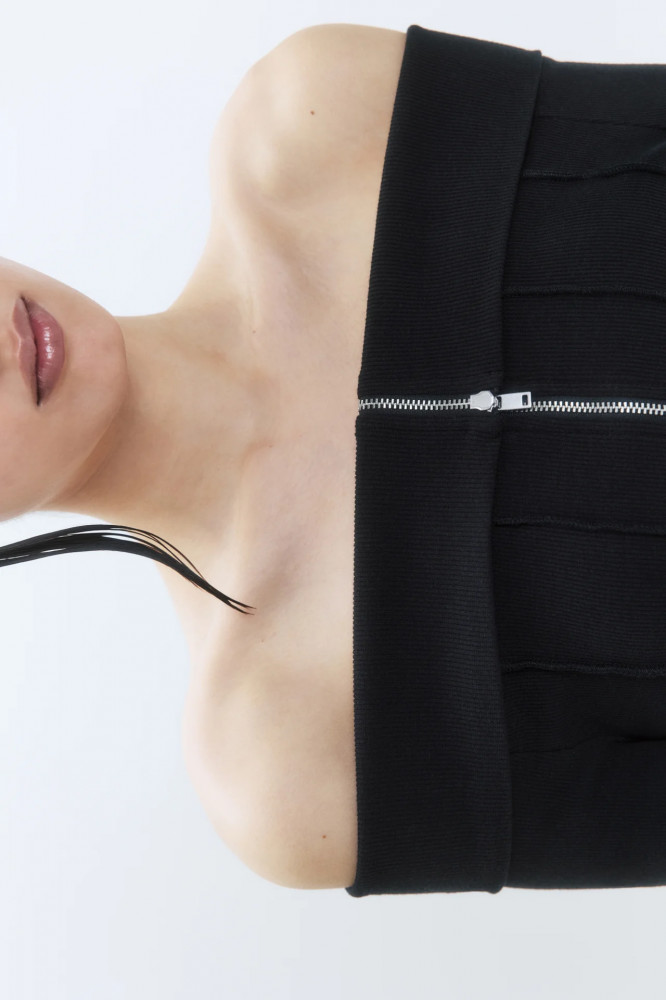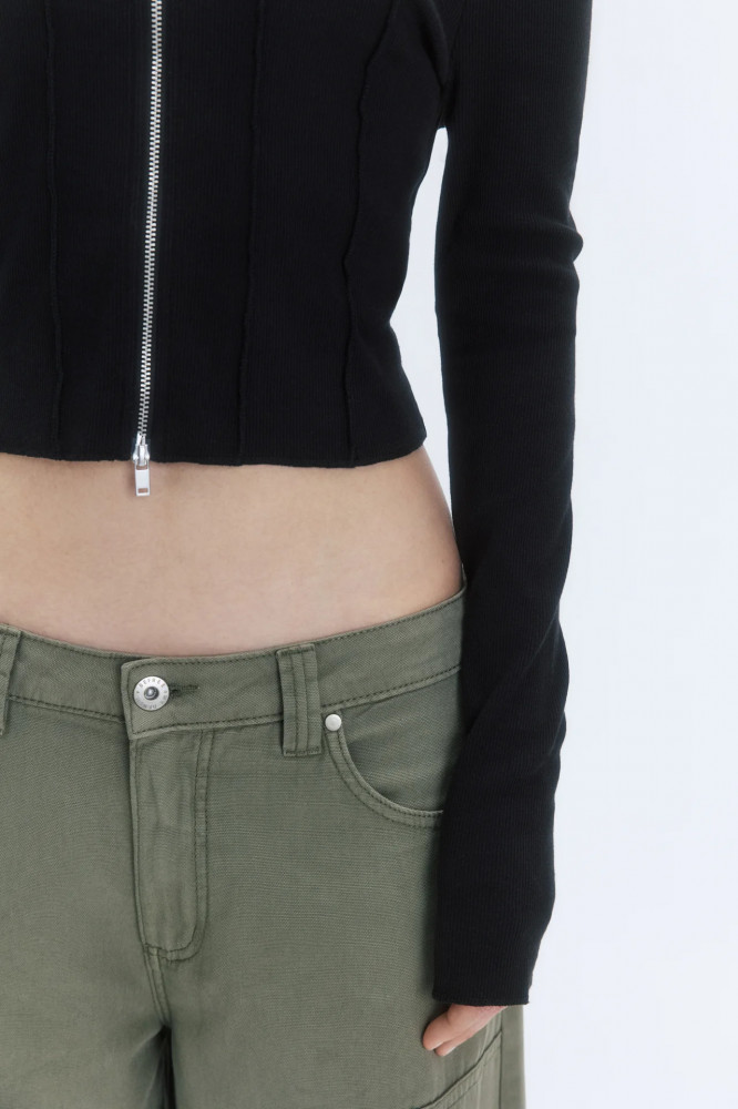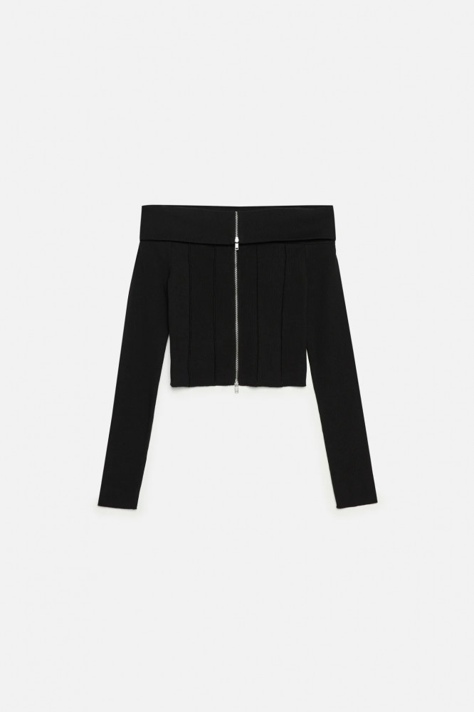 Короткая женская блузка-лонгслив облегающего кроя из мягкой, эластичной и очень приятной к телу смесовой ткани на основе хлопка. Вырез-хомут с открытыми плечами и широким отворотом. Длинные облегающие рукава с прямыми манжетами. Прямой нижний край без разрезов. Объемные декоративные швы спереди. Застежка на молнию по всей длине.