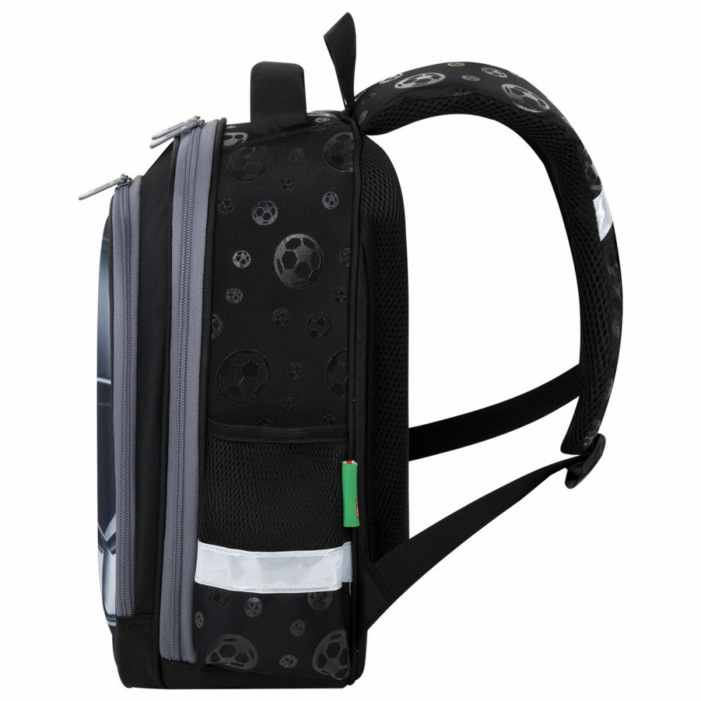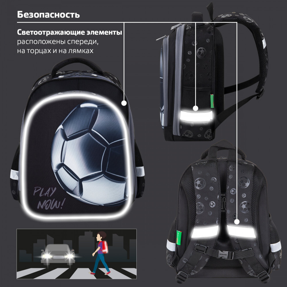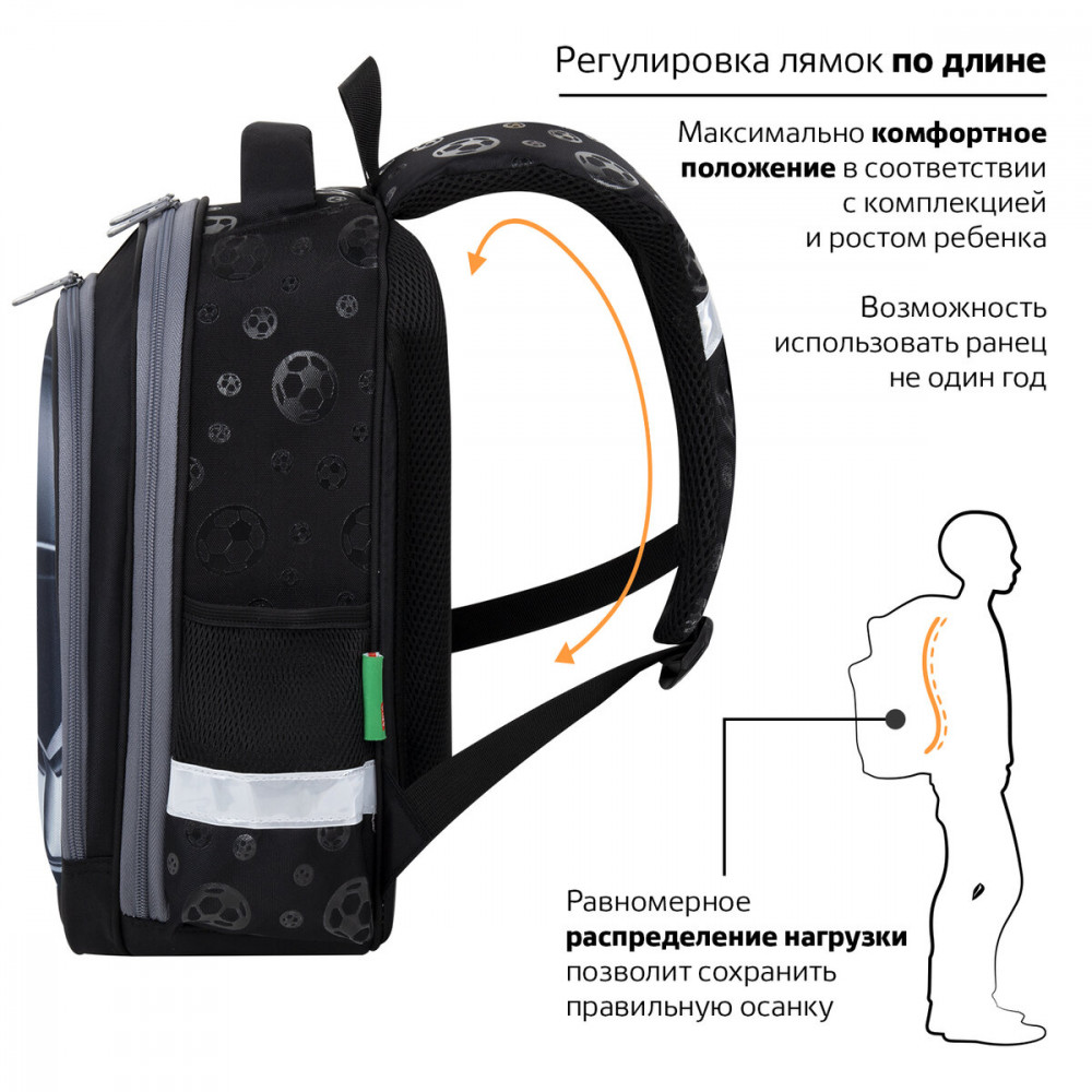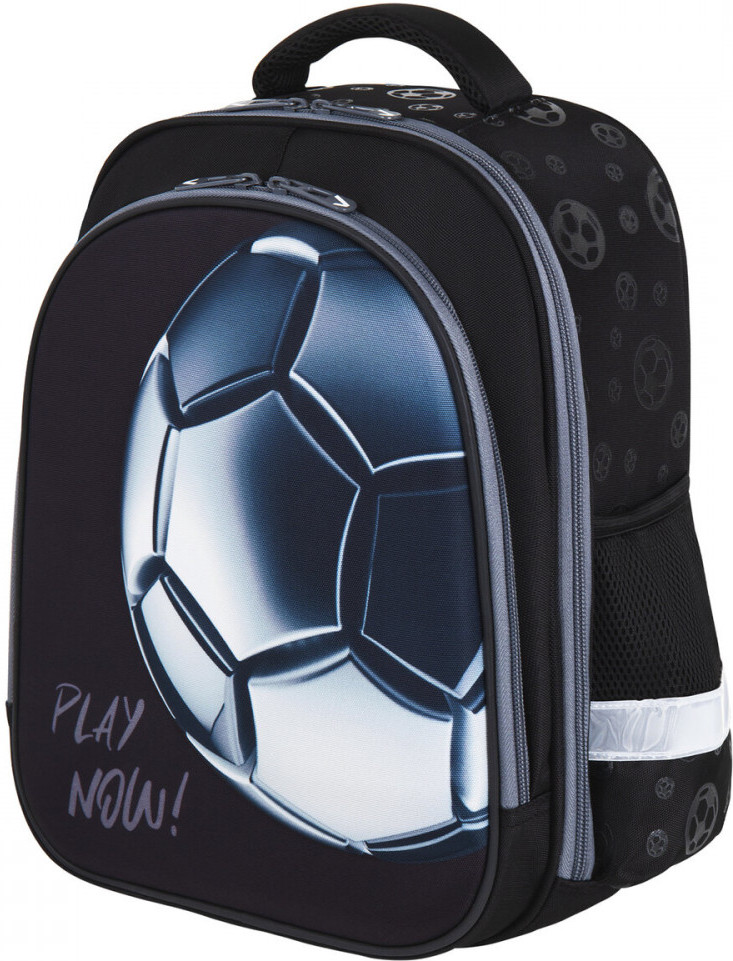Компактный ранец выполнен из легкого формоустойчивого материала EVA, благодаря которому содержимое ранца надежно защищено от деформации. Компактный размер, эргономичность, вместительность — главные преимущества данной модели. Ранцы протестированы НИИ гигиены и охраны здоровья детей и подростков ФГАУ «Национальный медицинский исследовательский центр здоровья детей». В рамках проведенных исследований* было установлено, что конструкции и материалы ученических ранцев соответствуют современным эргономическим требованиям и способствуют формированию здоровой осанки у школьников. На передней панели ранца реализован уникальный 3D-эффект — выпуклое рельефное изображение футбольного мяча!