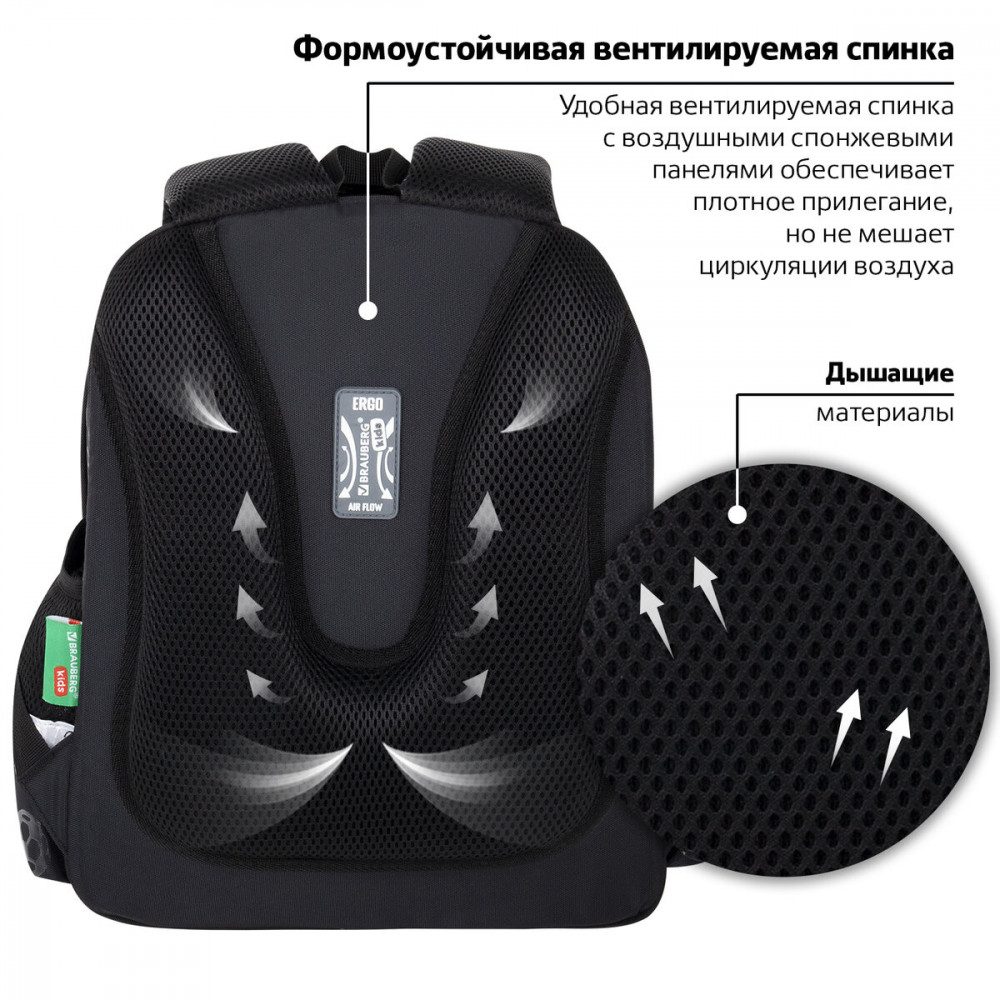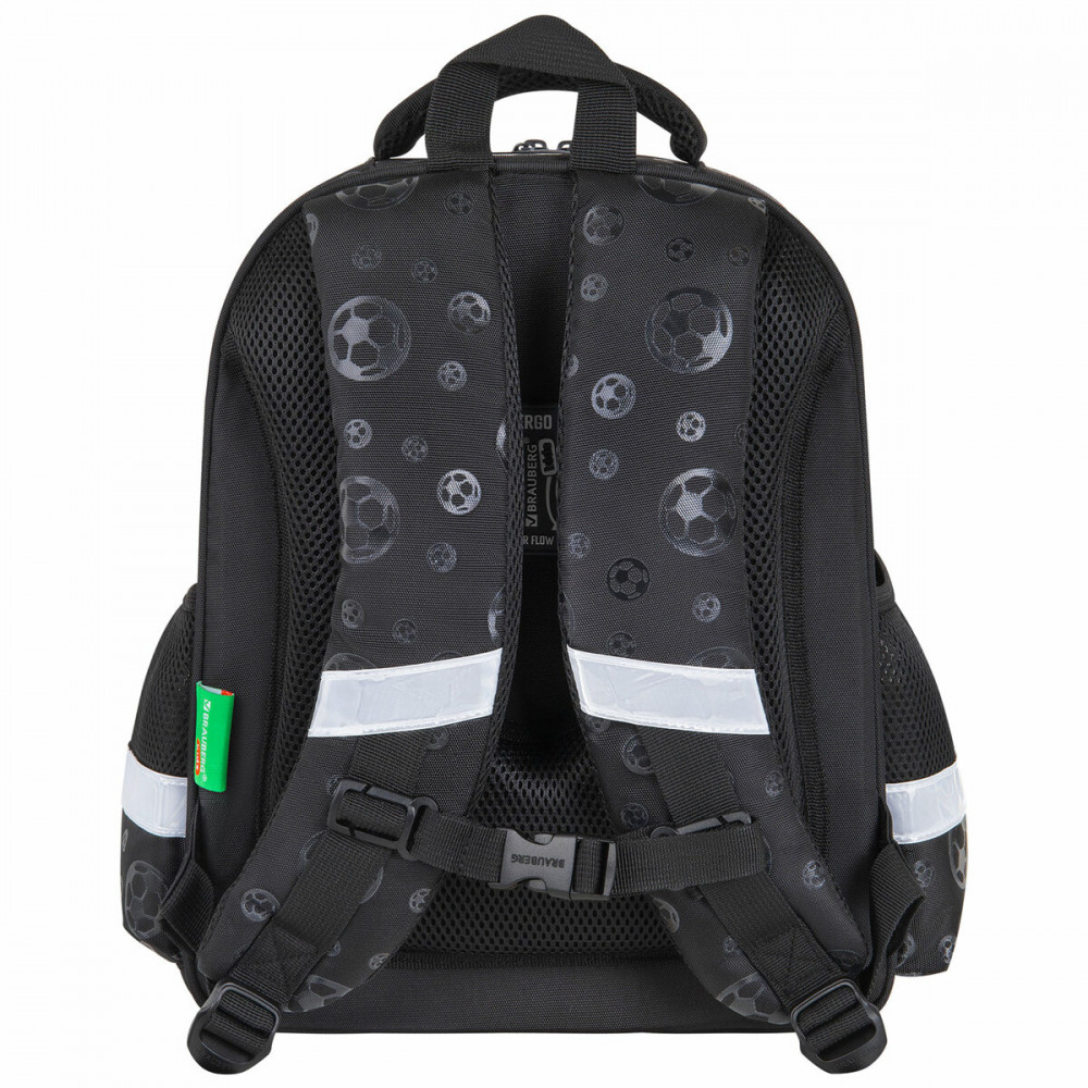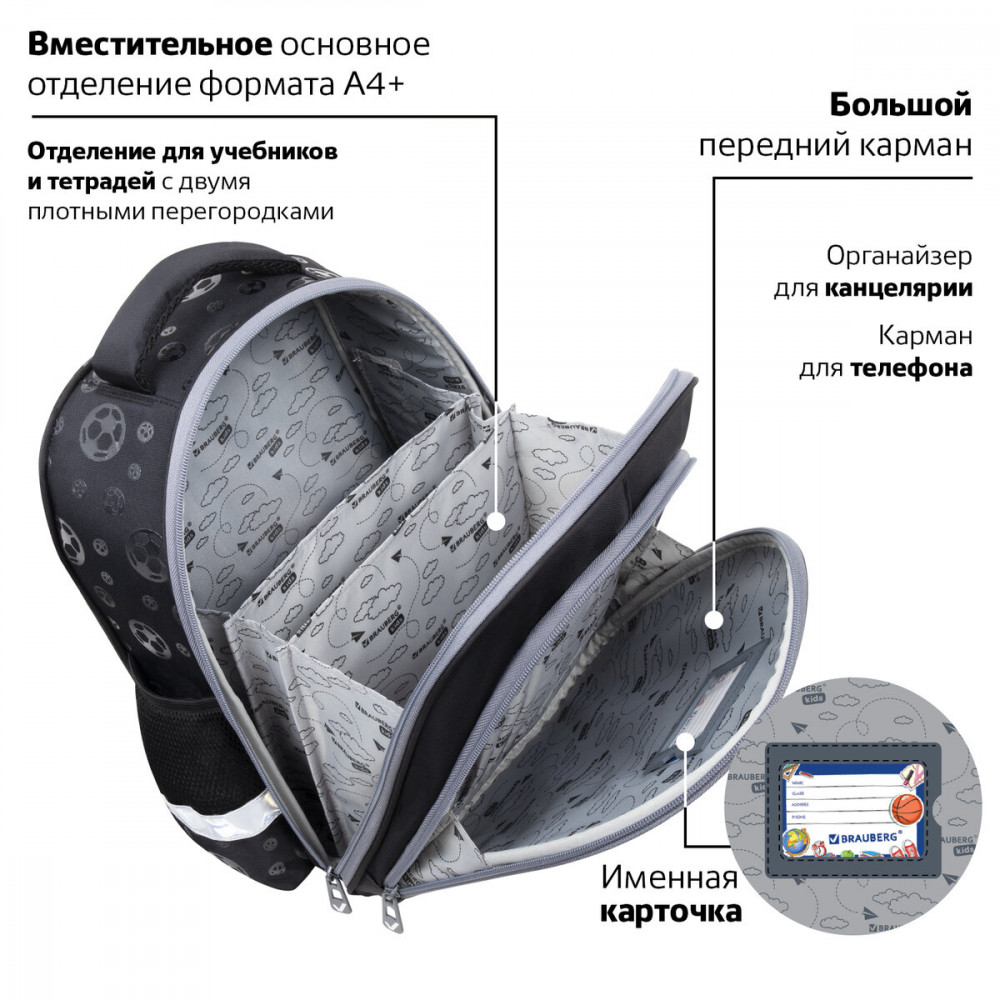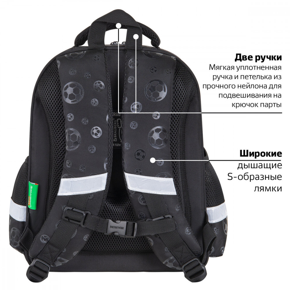 Компактный ранец выполнен из легкого формоустойчивого материала EVA, благодаря которому содержимое ранца надежно защищено от деформации. Компактный размер, эргономичность, вместительность — главные преимущества данной модели. Ранцы протестированы НИИ гигиены и охраны здоровья детей и подростков ФГАУ «Национальный медицинский исследовательский центр здоровья детей». В рамках проведенных исследований* было установлено, что конструкции и материалы ученических ранцев соответствуют современным эргономическим требованиям и способствуют формированию здоровой осанки у школьников. На передней панели ранца реализован уникальный 3D-эффект — выпуклое рельефное изображение футбольного мяча!