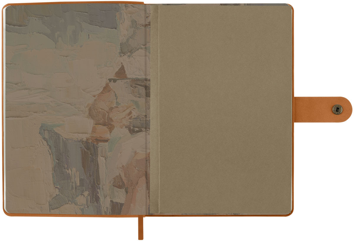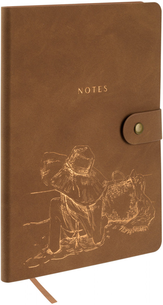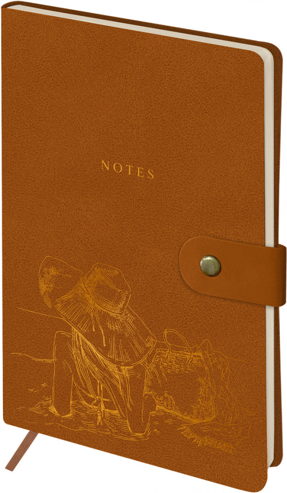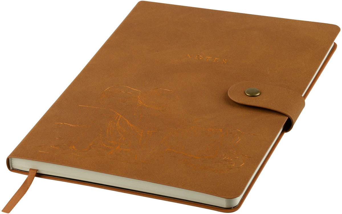 Обложка из экокожи дополнена фольгированным тиснением. В изделии используется интегральный (лайт) переплёт. Обложка записной книжки лёгкая, но при этом прочная и надёжная. Внутренний блок состоит из 80 листов тонированной бумаги повышенной плотности 80 г/кв.м. Книжка закрывается на кнопку, что дополнительно защищает листы от замятий и загрязнений. Предусмотрен кармашек для заметок и визиток. Закладка-ляссе позволяет открывать записную книжку сразу на нужной странице.