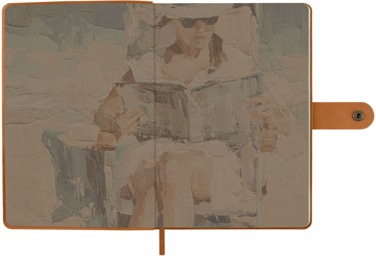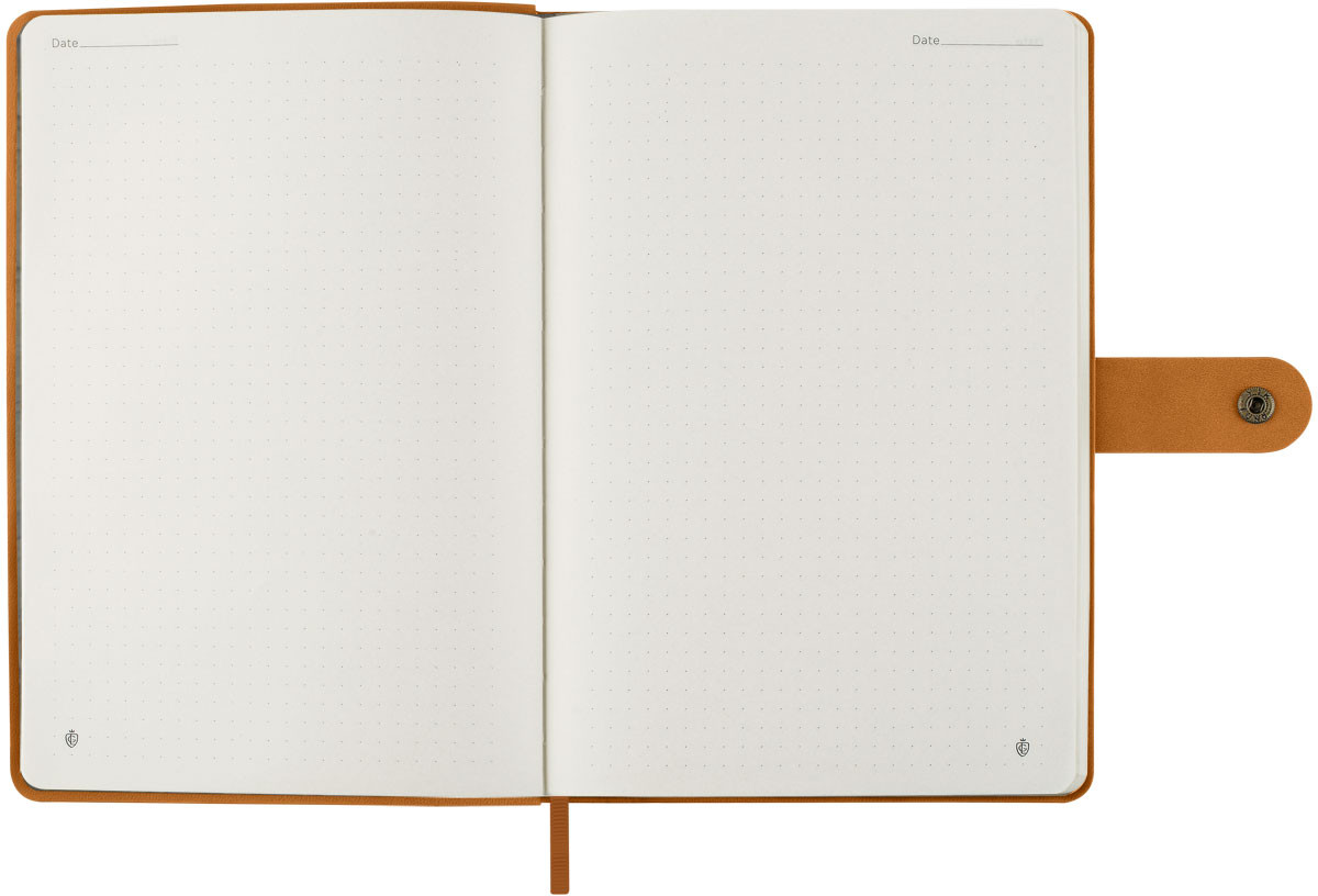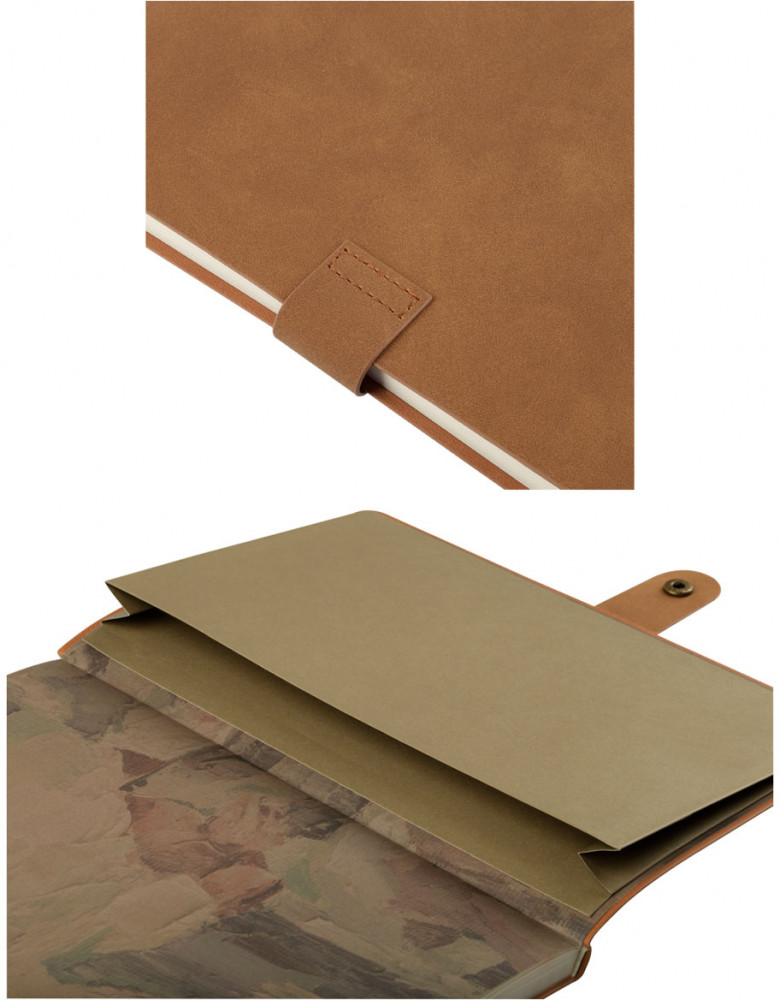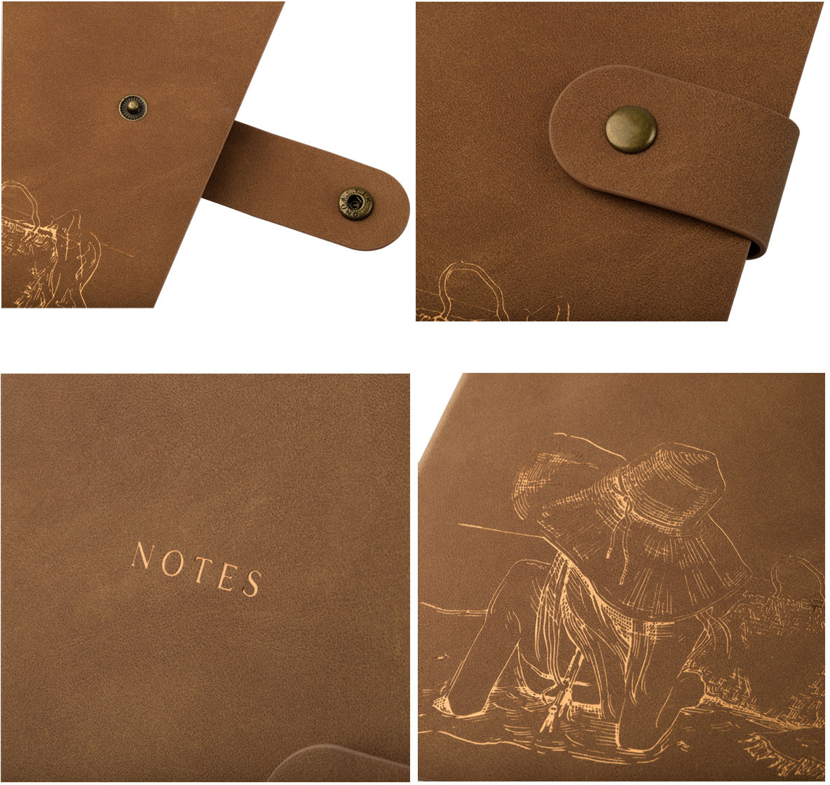 Обложка из экокожи дополнена фольгированным тиснением. В изделии используется интегральный (лайт) переплёт. Обложка записной книжки лёгкая, но при этом прочная и надёжная. Внутренний блок состоит из 80 листов тонированной бумаги повышенной плотности 80 г/кв.м. Книжка закрывается на кнопку, что дополнительно защищает листы от замятий и загрязнений. Предусмотрен кармашек для заметок и визиток. Закладка-ляссе позволяет открывать записную книжку сразу на нужной странице.