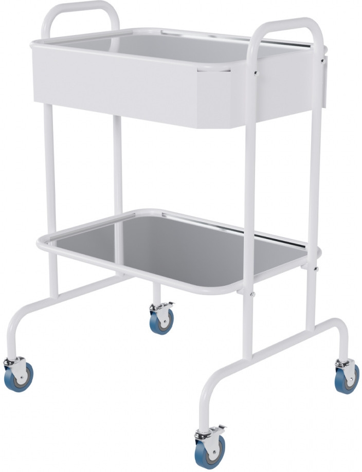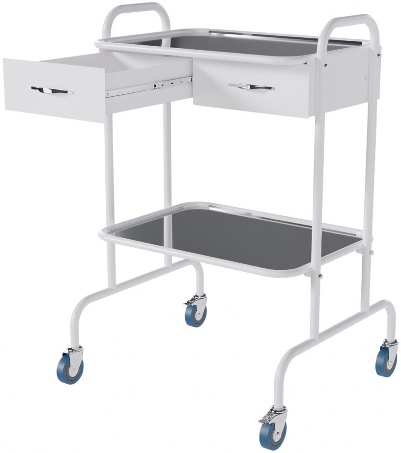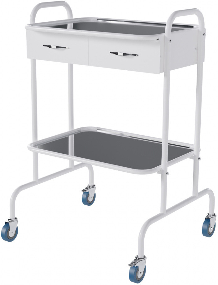 KZMED Стол медицинский «Стандарт»В данный момент этот товар отсутствует в продаже. Возможно, у нас найдется аналогичный или похожий товар здесь. Столик медицинский манипуляционный, 2 полки из нержавеющей стали, 2 ящика — металл, 1 с замком предназначен для размещения инструментов, материалов и медикаментов в стоматологических, гинекологических и урологических кабинетах. Конструкция столика разборная. Каркас столика выполнен сварным из стального профиля круглого сечения 20 мм с полимерно-порошковым покрытием или из нержавеющей стали. Столик имеет два выдвижных ящика, две панели из нержавеющей стали и две ручки. Столик оснащен четыремя колеса с серой шинкой из антистатической резины диаметром 50 мм (два из которых по желанию заказчика имеют индивидуальный тормоз). |