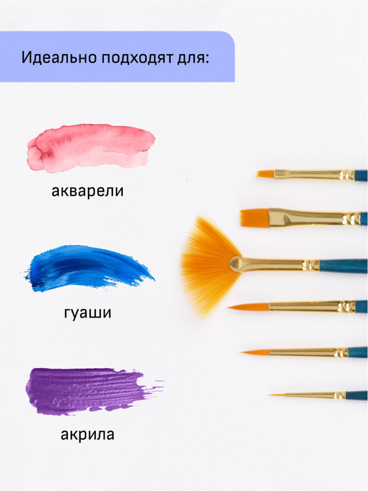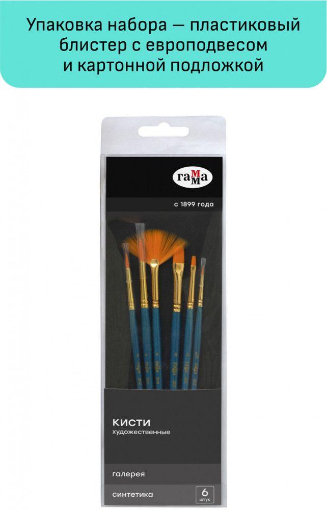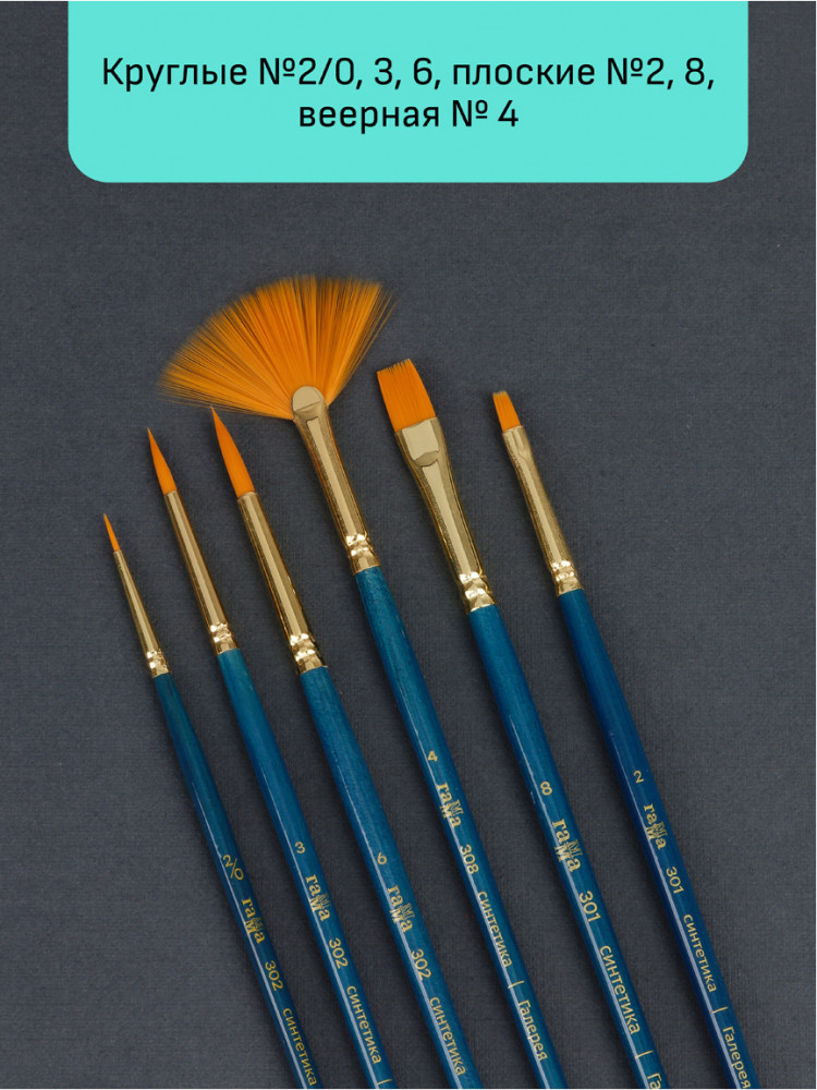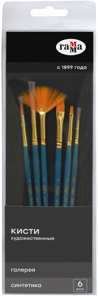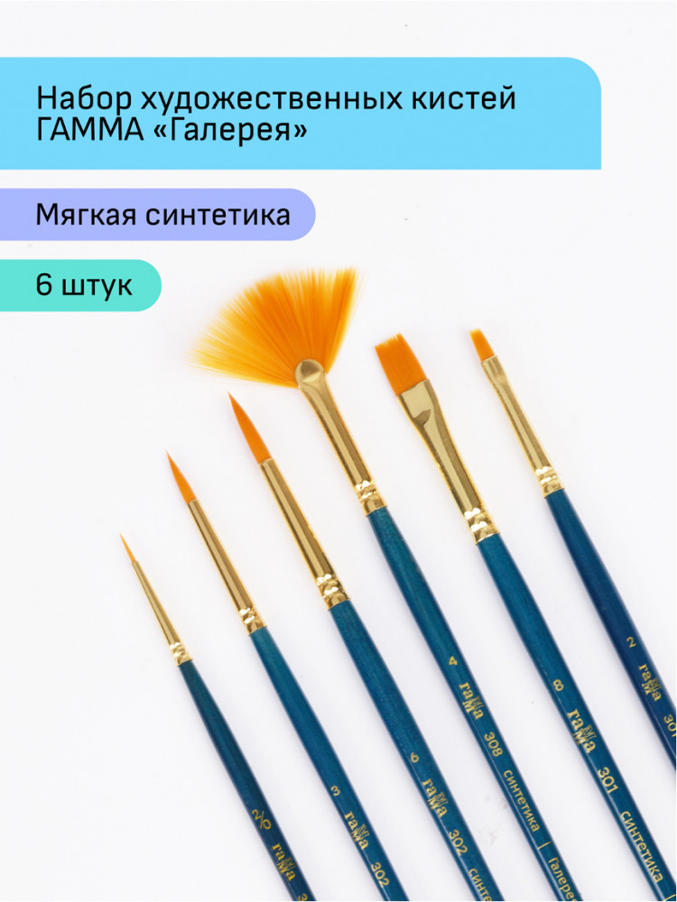 Серия: Галерея Набор художественных кистей Гамма серии «Галерея» состоит из 6 кистей востребованных форм и размеров: круглые № 2/0, 3, 6; плоские № 2, 8; веерная № 4. Кисти отлично подойдут для работы акварельными, гуашевыми и акриловыми красками.