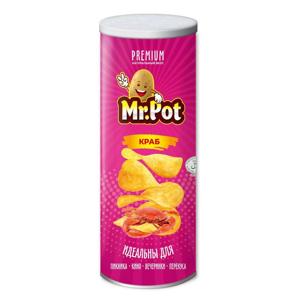 Картофельный порошок, картофельный крахмал, растительное масло, соль, сахар, эмульгатор E471. порошок приправы для крабов (сахар, соль, порошок крабов, порошок креветок, порошок рыбы, порошок чили, порошок яичного желтка, гидролизованный растительный белок, усилитель вкуса E621, мальтодекстрин, натуральный красный цвет паприки E160С, подсластитель аспартам E951 (содержит фенилаланин), антислеживающий агент диоксид кремния E551).