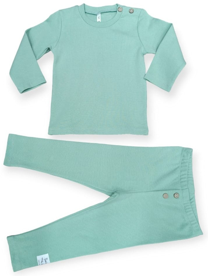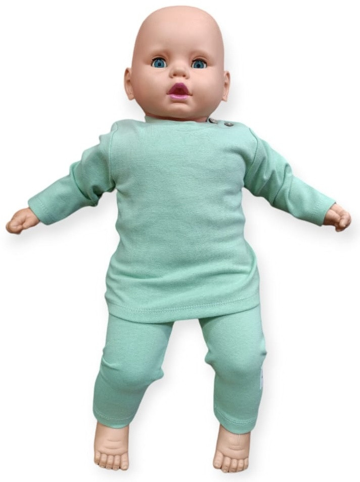 Комплект сшит из натуральной, мягкой и эластичной ткани рибана в составе которой хлопок и небольшое количество эластана, рубашка без манжета прямого кроя, штаники на поясе имеют эластичную резинку снизу прямые без манжета, спереди есть пуговки.