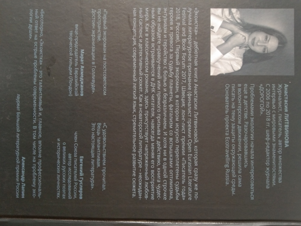 💳 Оплатить за товар можно при получении 🇰🇿 Есть бесплатная доставка по Казахстану 🎁 Копите бонусы с каждой покупки «Экоистка» — дебютная книга Анастасии Литвиновой, которая сразу же получила литературное признание, финалиста премии Open Eurasian Literature Festival and Book Forum 20017, Швеция, лонг-лист премии «Писатель года» 2018, Россия. Несколько недель в Тор на платформе «Литрес». Как в классическом романе здесь есть напряженный любовный саспенс и детективный сюжет. Как в новаторской литературе- неожиданная концепция, современный легкий язык, стремительное развитие сюжета. |