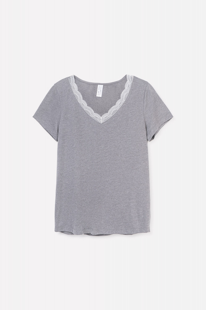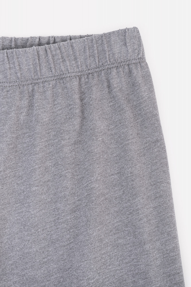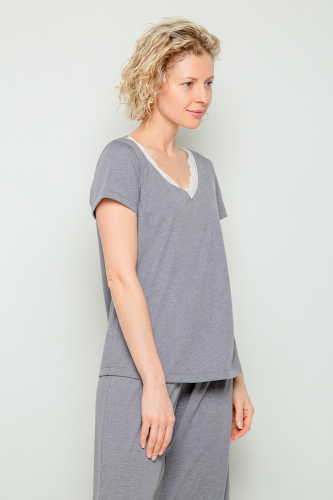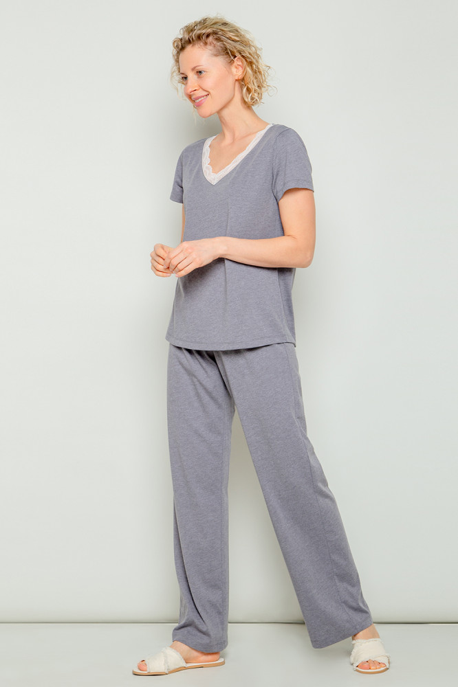 Уютная пижама для комфортного сна из хлопка с добавлением полиэстера. Футболка с короткими втачными рукавами и просторные брюки выполнены из однотонного трикотажа супрем с эффектом меланж. Ворот украшен эластичным кружевом. В брюках мягкий пояс на резинке, декорированный атласной лентой. Свободный силуэт. Гладкий материал приятен к телу, не теряет форму и позволяет коже дышать. Все трикотажные полотна производятся в соответствии с нормами Швейцарского сертификата ЭкоТекс.